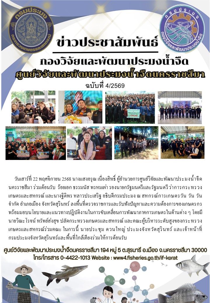 วันเสาร์ที่ 22 พฤศจิกายน 2568 นางแสงอรุณ เนื่องสิทธิ์ ผู้อำนวยการศูนย์วิจัยและพัฒนาประมงน้ำจืดนครราชสีมา ร่วมต้อนรับ  ร้อยเอก ธรรมนัส พรหมเผ่า รองนายกรัฐมนตรีและรัฐมนตรีว่าการกระทรวงเกษตรและสหกรณ์ และนางฐิติพร หลาวประเสริฐ อธิบดีกรมประมง ณ สหกรณ์การเกษตรวัน วัน วัน จำกัด อำเภอเมือง จังหวัดสุรินทร์ ลงพื้นที่ตรวจราชการและรับฟังปัญหาและความต้องการของเกษตรกร พร้อมมอบนโยบายและแนวทางปฏิบัติงานในการขับเคลื่อนการพัฒนาภาคการเกษตรในด้านต่าง ๆ โดยมีนายวิณะโรจน์ ทรัพย์ส่งสุข ปลัดกระทรวงเกษตรและสหกรณ์ และคณะผู้บริหารระดับสูงของกระทรวงเกษตรและสหกรณ์ร่วมคณะ ในการนี้ นายประชุม ดวนใหญ่ ประมงจังหวัดสุรินทร์ และเจ้าหน้าที่