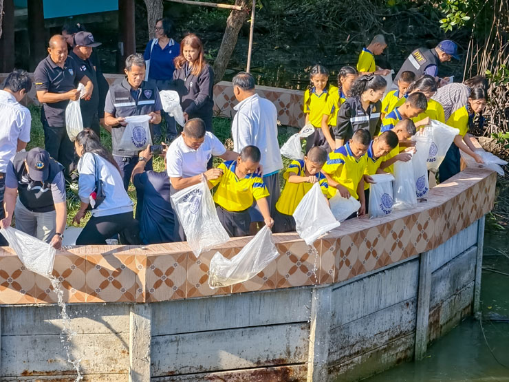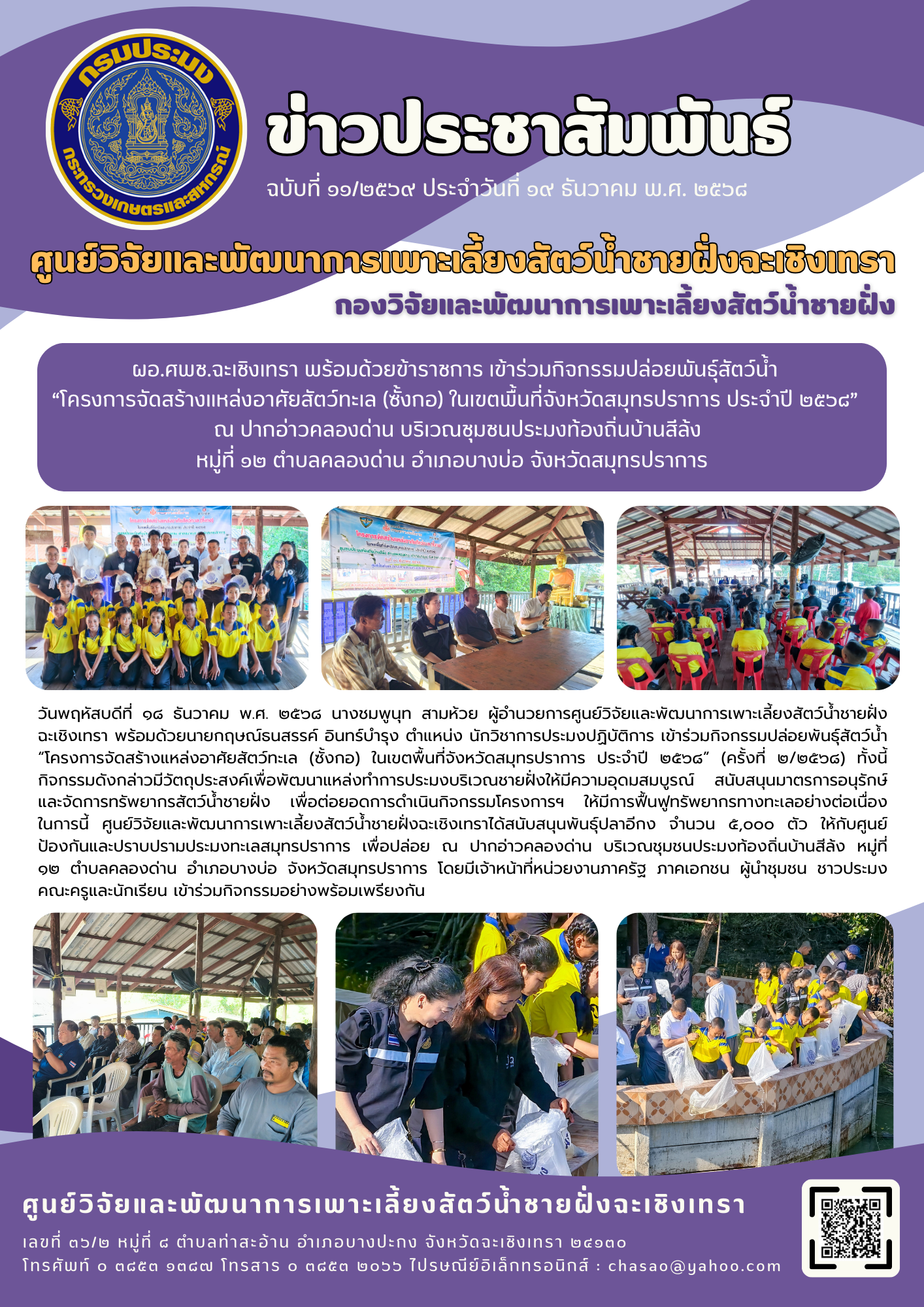 วันพฤหัสบดีที่ ๑๘ ธันวาคม พ.ศ. ๒๕๖๘ นางชมพูนุท สามห้วย ผู้อำนวยการศูนย์วิจัยและพัฒนาการเพาะเลี้ยงสัตว์น้ำชายฝั่งฉะเชิงเทรา พร้อมด้วยนายกฤษณ์ธนสรรค์ อินทร์บำรุง ตำแหน่ง นักวิชาการประมงปฏิบัติการ เข้าร่วมกิจกรรมปล่อยพันธุ์สัตว์น้ำ “โครงการจัดสร้างแหล่งอาศัยสัตว์ทะเล (ซั้งกอ) ในเขตพื้นที่จังหวัดสมุทรปราการ ประจำปี ๒๕๖๘” (ครั้งที่ ๒/๒๕๖๘) ทั้งนี้ กิจกรรมดังกล่าวมีวัตถุประสงค์เพื่อพัฒนาแหล่งทำการประมงบริเวณชายฝั่งให้มีความอุดมสมบูรณ์ สนับสนุนมาตรการอนุรักษ์และจัดการทรัพยากรสัตว์น้ำชายฝั่ง เพื่อต่อยอดการดำเนินกิจกรรมโครงการฯ ให้มีการฟื้นฟูทรัพยากรทางทะเลอย่างต่อเนื่อง ในการนี้ ศูนย์วิจัยและพัฒนาการเพาะเลี้ยงสัตว์น้ำชายฝั่งฉะเชิงเทราได้สนับสนุนพันธุ์ปลาอีกง จำนวน ๕,๐๐๐ ตัว ให้กับศูนย์ป้องกันและปราบปรามประมงทะเลสมุทรปราการ เพื่อปล่อย ณ ปากอ่าวคลองด่าน บริเวณชุมชนประมงท้องถิ่นบ้านสีล้ง หมู่ที่ ๑๒ ตำบลคลองด่าน อำเภอบางบ่อ จังหวัดสมุทรปราการ โดยมีเจ้าหน้าที่หน่วยงานภาครัฐ ภาคเอกชน ผู้นำชุมชน ชาวประมง คณะครูและนักเรียน เข้าร่วมกิจกรรมอย่างพร้อมเพรียงกัน