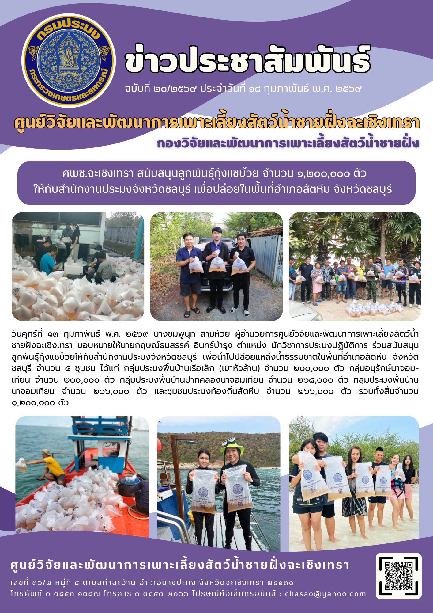 วันศุกร์ที่ ๑๓ กุมภาพันธ์ พ.ศ. ๒๕๖๙ นางชมพูนุท สามห้วย ผู้อำนวยการศูนย์วิจัยและพัฒนาการเพาะเลี้ยงสัตว์น้ำชายฝั่งฉะเชิงเทรา มอบหมายให้นายกฤษณ์ธนสรรค์ อินทร์บำรุง ตำแหน่ง นักวิชาการประมงปฏิบัติการ ร่วมสนับสนุนลูกพันธุ์กุ้งแชบ๊วยให้กับสำนักงานประมงจังหวัดชลบุรี เพื่อนำไปปล่อยแหล่งน้ำธรรมชาติในพื้นที่อำเภอสัตหีบ จังหวัดชลบุรี จำนวน ๕ ชุมชน ได้แก่ กลุ่มประมงพื้นบ้านเรือเล็ก (เขาหัวล้าน) จำนวน ๒๐๐,๐๐๐ ตัว กลุ่มอนุรักษ์นาจอมเทียน จำนวน ๒๐๐,๐๐๐ ตัว กลุ่มประมงพื้นบ้านปากคลองนาจอมเทียน จำนวน ๒๖๘,๐๐๐ ตัว กลุ่มประมงพื้นบ้านนาจอมเทียน จำนวน ๒๖๖,๐๐๐ ตัว และชุมชนประมงท้องถิ่นสัตหีบ จำนวน ๒๖๖,๐๐๐ ตัว รวมทั้งสิ้นจำนวน ๑,๒๐๐,๐๐๐ ตัว