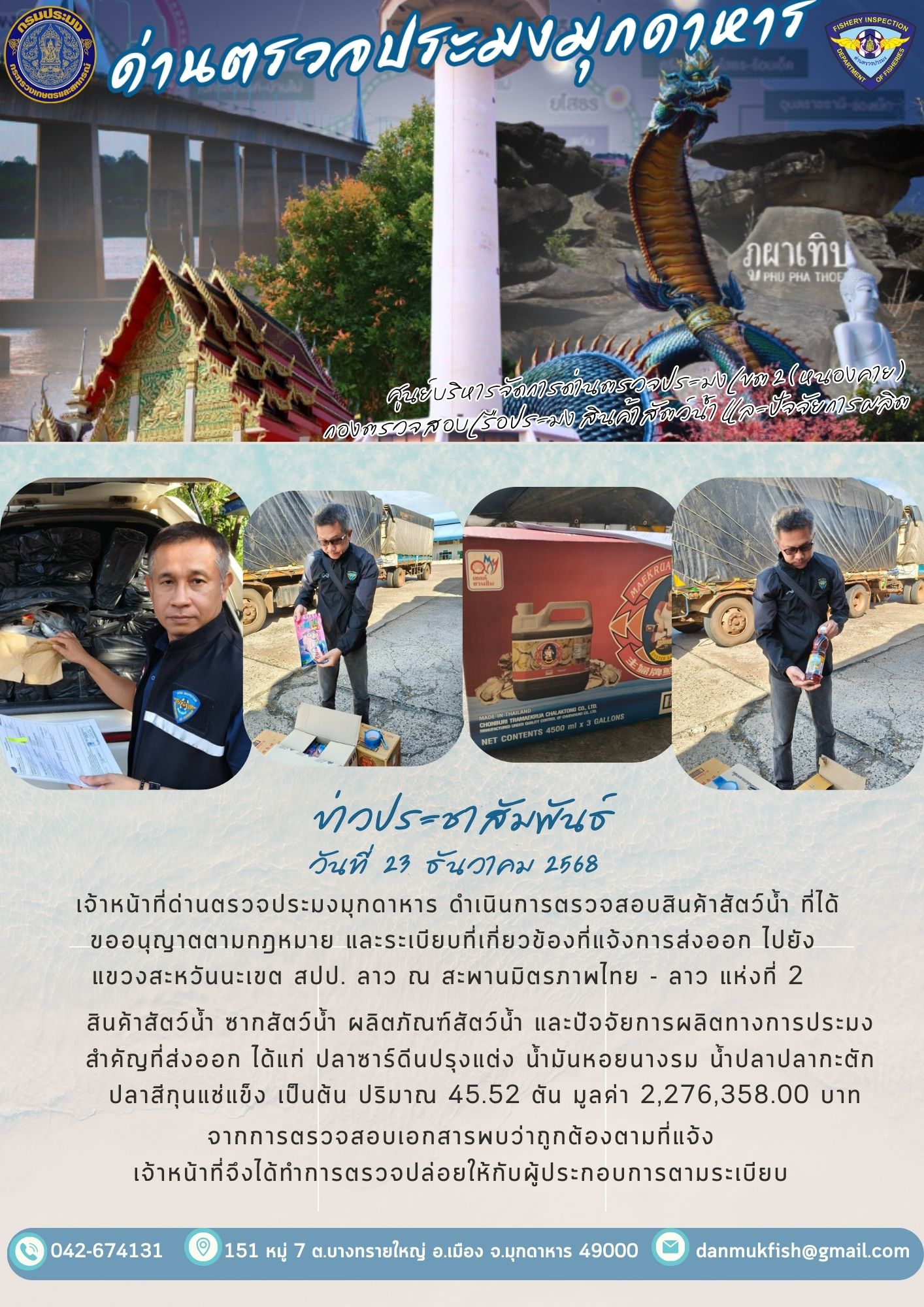 เจ้าหน้าที่ด่านตรวจประมงมุกดาหารตรวจสอบ สินค้าสัตว์น้ำ ซากสัตว์น้ำ ผลิตภัณฑ์สัตว์น้ำ และปัจจัยการผลิตทางการประมงสำคัญที่ส่งออก ได้แก่  ปลาซาร์ดีนปรุงแต่ง น้ำมันหอยนางรม น้ำปลาปลากะตัก ปลาสีกุนแช่แข็ง เป็นต้น ปริมาณ 45.52 ตัน มูลค่า 2,276,358.00 บาท ส่งออกไปยังแขวงสะหวันนะเขต สปป. ลาว ณ สะพานมิตรภาพไทย - ลาว แห่งที่ 2 จังหวัดมุกดาหาร ผลการตรวจสอบสินค้าสัตว์น้ำ ถูกต้องตามใบแจ้งดำเนินการส่งออกสัตว์น้ำหรือผลิตภัณฑ์สัตว์น้ำ เจ้าหน้าที่จึงดำเนินการตรวจปล่อยตามระเบียบต่อไป
