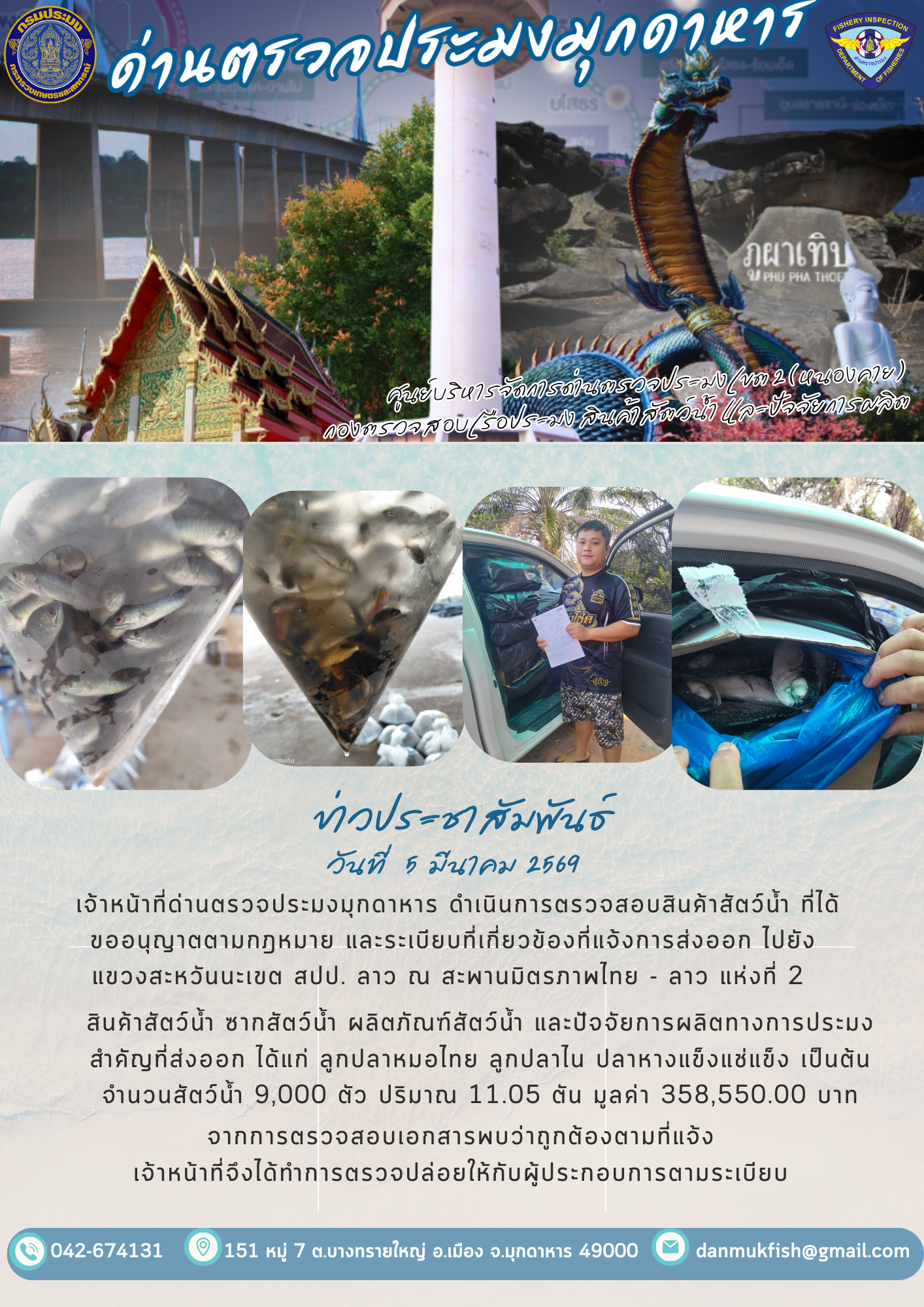 เจ้าหน้าที่ด่านตรวจประมงมุกดาหารตรวจสอบ สินค้าสัตว์น้ำ ซากสัตว์น้ำ ผลิตภัณฑ์สัตว์น้ำ และปัจจัยการผลิตทางการประมงสำคัญที่ส่งออก ได้แก่  ลูกปลาหมอไทย ลูกปลาไน ปลาหางแข็งแช่แข็ง เป็นต้น จำนวนสัตว์น้ำ 9,000 ตัว ปริมาณ 11.05 ตัน มูลค่า 358,550.00 บาท  ส่งออกไปยังแขวงสะหวันนะเขต สปป. ลาว ณ สะพานมิตรภาพไทย - ลาว แห่งที่ 2 จังหวัดมุกดาหาร ผลการตรวจสอบสินค้าสัตว์น้ำ ถูกต้องตามใบแจ้งดำเนินการส่งออกสัตว์น้ำหรือผลิตภัณฑ์สัตว์น้ำ เจ้าหน้าที่จึงดำเนินการตรวจปล่อยตามระเบียบต่อไป