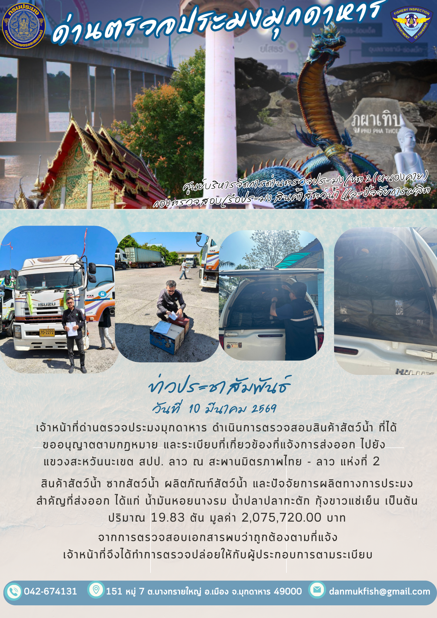 เจ้าหน้าที่ด่านตรวจประมงมุกดาหารตรวจสอบ สินค้าสัตว์น้ำ ซากสัตว์น้ำ ผลิตภัณฑ์สัตว์น้ำ และปัจจัยการผลิตทางการประมงสำคัญที่ส่งออก ได้แก่  น้ำมันหอยนางรม น้ำปลาปลากะตัก กุ้งขาวแช่เย็น เป็นต้น ปริมาณ 19.83 ตัน มูลค่า 2,075,720.00 บาท ส่งออกไปยังแขวงสะหวันนะเขต สปป. ลาว ณ สะพานมิตรภาพไทย - ลาว แห่งที่ 2 จังหวัดมุกดาหาร ผลการตรวจสอบสินค้าสัตว์น้ำ ถูกต้องตามใบแจ้งดำเนินการส่งออกสัตว์น้ำหรือผลิตภัณฑ์สัตว์น้ำ เจ้าหน้าที่จึงดำเนินการตรวจปล่อยตามระเบียบต่อไป