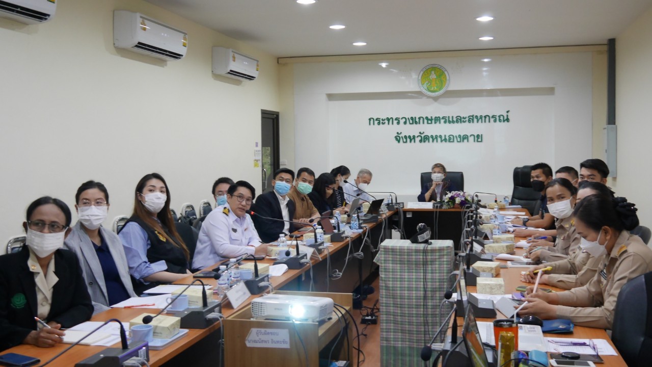 คณะผู้บิหาร และเจ้าหน้าที่สำนักงานสินค้ามาตรฐานสินค้าเกษตรและอาหารแห่งชาติ โดยมี ดร.เสริมสุข สลักเพ็ชร์ ที่ปรึกษาสำนักงานสินค้ามาตรฐานสินค้าเกษตรและอาหารแห่งชาติ เป็นประธานการประชุมทางไกลผ่านระบบ Zoom Meeting จากห้องประชุมพระพิรุณ ศาลากลางจังหวัดหนองคาย ชั้น 3 ร่วมกับผู้แทนหน่วยงานด่านศุลกากรหนองคาย หัวหน้าด่านตรวจพืชหนองคาย ผู้แทนด่านกักกันสัตว์หนองคาย ผู้แทนศูนย์บริหารจัดการด่านตรวจประมง เขต 2 (หนองคาย) เพื่อติดตามสถานการณ์การนำเข้า-ส่งออกสินค้าเกษตรระหว่างไทยและจีนด้วยการขนส่งผ่านเส้นทางรถไฟลาว-จีน ปัญหาและข้อจำกัดในปัจจุบันหลังมีการดำเนินการแล้ว เพื่อประโยชน์ในการพิจารณาปรับร่างแผนการเตรียมความพร้อมในการบริการในส่วนของภาคเกษตร