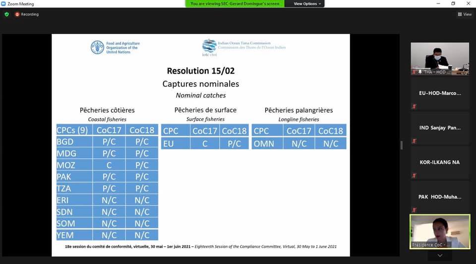 วันอาทิตย์ที่ 30 พฤษภาคม พ.ศ.2564 เวลา 14.00 น. ณ ห้องประชุมศูนย์ปฏิบัติการเฝ้าระวังการทำการประมง (FMC) กรมประมง นายบัญชา สุขแก้ว รองอธิบดีกรมประมง ในฐานะหัวหน้าผู้แทนประเทศไทย พร้อมด้วยนางสัมพันธ์ ปานจรัตน์ ผู้อำนวยการกองนโยบายและแผนพัฒนาการประมง นายอภิชาติ สมฤทธิ์ ผู้อำนวยการกองบริหารจัดการเรือประมงและการทำการประมง ร่วมกับเจ้าหน้าที่ๆ เกี่ยวข้อง เข้าร่วมประชุมคณะกรรมการปฏิบัติการ ครั้งที่ 18 (the 18th Session of the Compliance Committee) ภายใต้กรอบคณะกรรมาธิการปลาทูน่าแห่งมหาสมุทรอินเดีย (Indian Ocean Tuna Commission; IOTC) ซึ่งมีกำหนดจัดการประชุมในระหว่างวันที่ 30 พฤษภาคม 2564 ถึงวันที่ 1 มิถุนายน 2564 เวลา 14.00 – 18.00 น. ผ่านระบบ VDO Conference โดยจะมีการพิจารณาข้อมูล ดังนี้
