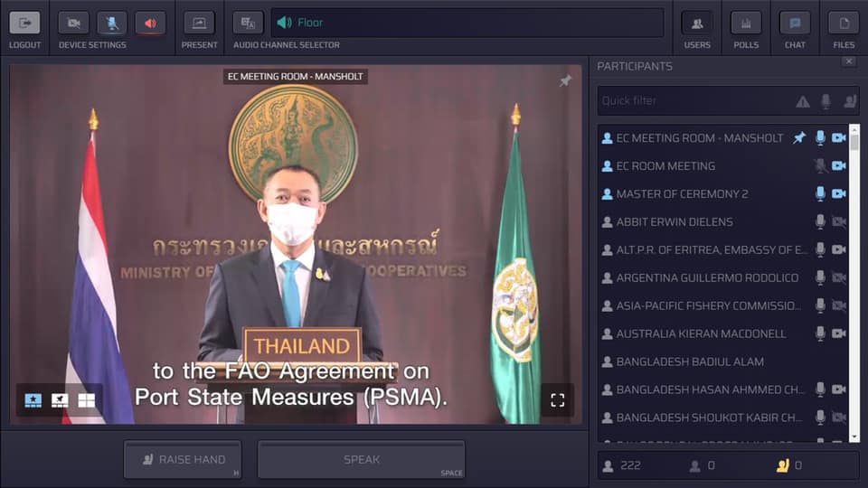 ดร.เฉลิมชัย ศรีอ่อน รัฐมนตรีว่าการกระทรวงเกษตรและสหกรณ์ เป็นผู้แทนประเทศไทยที่ได้รับเกียรติให้เป็นหนึ่งในประเทศสมาชิกขึ้นกล่าวสุนทรพจน์ระดับรัฐมนตรี (Testimonial Statement) ร่วมกับรัฐมนตรีจาก 6 ประเทศ โดยกล่าวว่า ประเทศไทยได้กำหนดให้การต่อต้านการทำประมงผิดกฎหมาย เป็นวาระแห่งชาติ ตั้งแต่ปี พ.ศ. 2558 โดยมีการปฏิรูปกฎหมาย เพื่อให้การบริหารจัดการด้านประมงของประเทศไทยสอดคล้องกับมาตรฐานและกฎระเบียบระหว่างประเทศ โดยในช่วง 5 ปีที่ผ่านมา ไทยได้นำมาตรการ PSMA มาสู่การปฏิบัติเป็นผลสำเร็จ โดยการใช้มาตรการป้องกันมิให้เรือประมงที่เกี่ยวข้องกับการทำประมงผิดกฎหมายเข้าเทียบท่า ทำให้มีสถิติการจับกุมและปฏิเสธการเทียบท่าของสินค้าสัตว์น้ำที่ผิดกฎหมาย และการใช้มาตรการทางกฎหมายต่างๆ ที่เกี่ยวข้องมาใช้ในการปฏิบัติงานของหน่วยงานที่เกี่ยวข้อง ซึ่งความสำเร็จดังกล่าวเกิดจากความร่วมมือกันของรัฐภาคี และหน่วยงานที่เกี่ยวข้อง ได้แก่ รัฐเจ้าของธง รัฐชายฝั่ง รัฐเจ้าท่า และรัฐเจ้าของตลาด รวมทั้งองค์กรภายในและระหว่างประเทศที่เกี่ยวข้องตลอดห่วงโซ่คุณค่าของสินค้าการประมง