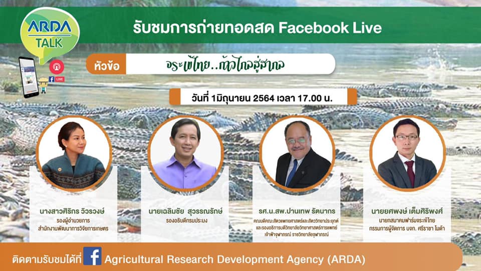 วันอังคารที่ 1 มิถุนายน 2564 เวลา 17.00 น. ณ ห้องประชุมยี่สก ชั้น 2 อาคารจุฬาภรณ์ กรมประมง นายเฉลิมชัย สุวรรณรักษ์ รองอธิบดีกรมประมง เข้าร่วมเป็นวิทยากรการเสวนาออนไลน์ ในประเด็น "จระเข้ไทย...ก้าวไกลสู่สากล" ผ่านการถ่ายทอดสด Facebook live รายการ ARDA talk ที่จัดขึ้นโดยสำนักงานพัฒนาการวิจัยการเกษตร (องค์การมหาชน) โดยในการเสวนามีการพูดคุยกันในหลากหลายประเด็น อาทิ สถานการณ์จระเข้สายพันธุ์ไทยในปัจจุบัน การเกี่ยวข้องกับอนุสัญญาไซเตส (CITES) แผนการบริหารจัดการจระเข้ไทยของกรมประมง รวมถึงการดำเนินการขอปรับลดบัญชีจระเข้ของไทยให้อยู่ในหลักเกณฑ์ของอนุสัญญาไซเตส (CITES) ที่สามารถส่งออกจระเข้ไทยไปต่างประเทศ ซึ่งการเสวนาครั้งนี้มีนางสาวศิริกร วิวรวงษ์ รองผู้อำนวยการสำนักงานพัฒนาการวิจัยการเกษตร รศ.น.สพ.ปานเทพ รัตนากร คณบดีคณะสัตวแพทยศาสตร์และสัตววิทยาประยุกต์และรองอธิการบดีวิทยาลัยวิทยาศาสตร์การแพทย์เจ้าฟ้าจุฬาภรณ์ ราชวิทยาลัยจุฬาภรณ์ และนายยศพงษ์ เต็มศิริพงษ์ นายกสมาคมฟาร์มจระเข้ไทย กรรมการผู้จัดการ บจก. ศรีราชา โมด้า ร่วมเป็นวิทยากรในครั้งนี้ด้วย