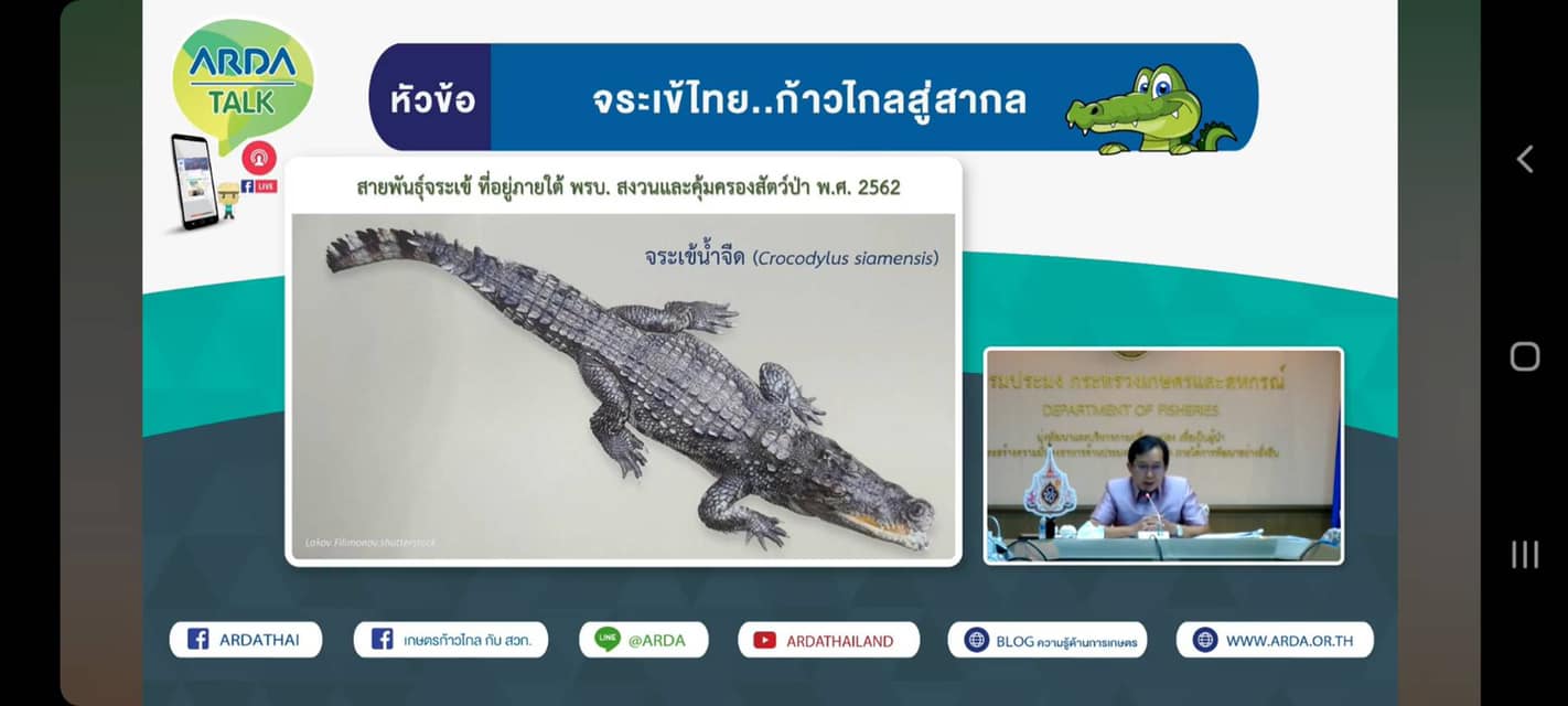 นายเฉลิมชัย สุวรรณรักษ์ รองอธิบดีกรมประมง เข้าร่วมเป็นวิทยากรการเสวนาออนไลน์ ในประเด็น "จระเข้ไทย...ก้าวไกลสู่สากล" ผ่านการถ่ายทอดสด Facebook live
