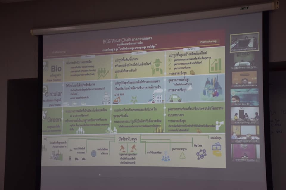 วันอังคารที่ 21 กันยายน 2564 เวลา 13.30 น. ณ ห้องประชุมปากเปี่ยน กรมประมง ดร.วิชาญ อิงศรีสว่าง รองอธิบดีกรมประมง เข้าร่วมการประชุมคณะกรรมการขับเคลื่อนการพัฒนาเศรษฐกิจชีวภาพ เศรษฐกิจหมุนเวียน และเศรษฐกิจสีเขียว (BCG Model) ด้านการเกษตร ครั้งที่ 2/2564 ในฐานะกรรมการและผู้แทนกรมประมง ร่วมกับหน่วยงานที่เกี่ยวข้องภายใต้สังกัดกระทรวงเกษตรและสหกรณ์ ผ่านการประชุมทางไกลโปรแกรม Zoom Meetings โดยมีนายสำราญ สาราบรรณ์ รองปลัดกระทรวงเกษตรและสหกรณ์ เป็นประธานในการประชุม ซึ่งที่ประชุมได้ร่วมรับทราบและพิจารณาโครงการขับเคลื่อน BCG Value Chain ภาคการเกษตรของหน่วยงานในสังกัดกระทรวงเกษตรและสหกรณ์ ปีงบประมาณ 2566-2570 ทั้งระดับกรมและระดับจังหวัด รวมถึงหารือแผนการสร้างการรับรู้เกี่ยวกับโมเดลเศรษฐกิจ BCG ภาคการเกษตรของหน่วยงานในสังกัดกระทรวงเกษตรฯ เพื่อให้บุคลากรภาครัฐและประชาชนได้มีความรู้ ความเข้าใจเกี่ยวกับโมเดลเศรษฐกิจ BCG ซึ่งเป็นรูปแบบการพัฒนาเศรษฐกิจแบบใหม่ของไทยที่มุ่งการพัฒนาอย่างยั่งยืน