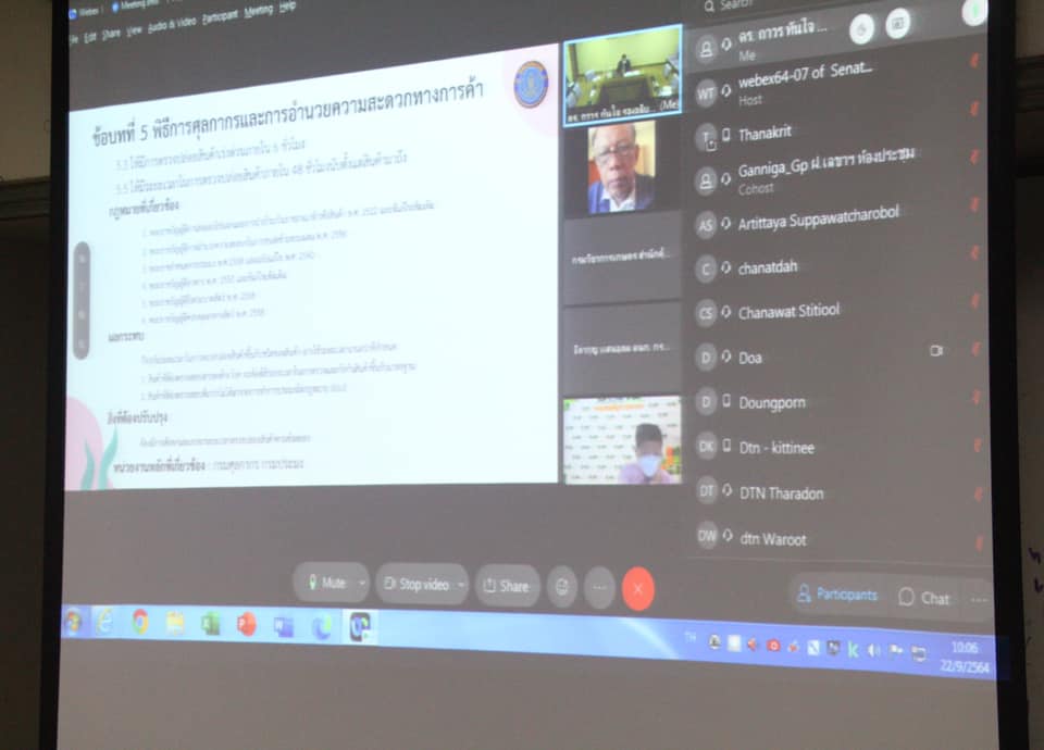 วันพุธที่ 22 กันยายน 2564 เวลา 09.00 น. ณ ห้องประชุมอินทรี ชั้น 4 อาคารจุฬาภรณ์ กรมประมง ดร.ถาวร ทันใจ รองอธิบดีกรมประมง พร้อมด้วย นายประพันธ์ โนระดี หัวหน้ากลุ่มวิเคราะห์การค้าสินค้าประมงระหว่างประเทศ เข้าร่วมประชุมกับคณะทำงานพิจารณาศึกษาความตกลง CPTPP ต่อผลกระทบที่จะเกิดขึ้นกับภาคการเกษตร ในคณะกรรมาธิการการเกษตรและสหกรณ์ วุฒิสภา ร่วมกับเจ้าหน้าที่ที่เกี่ยวข้อง เพื่อให้ข้อมูลเกี่ยวกับการปรับปรุงกฎหมายภายในประเทศ ผลกระทบของ CPTPP ต่อกฎหมาย และระเบียบต่าง ๆ รวมทั้งข้อดี ข้อเสีย วิธีการแก้ไข และการเตรียมการเกี่ยวกับกฎหมาย เพื่อลดผลกระทบต่อภาคประมงกรณีประเทศไทยเข้าร่วมเป็นภาคี ผ่านระบบ Cisco Webex Meetings