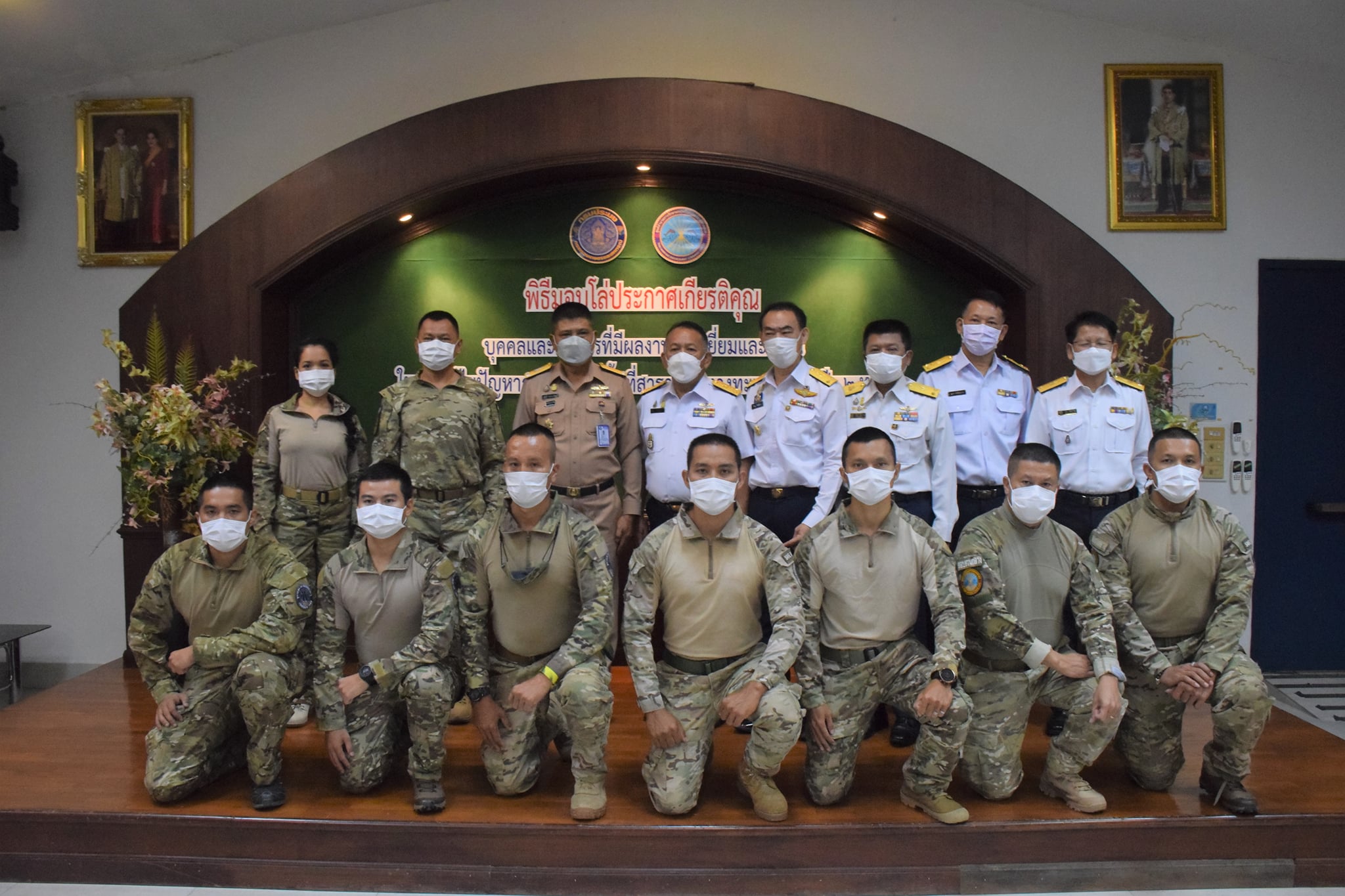 วันที่ 28 กันยายน 2564 เวลา 09.00 น. ณ ห้องประชุมพะยูน กรมประมงจัดพิธีมอบโล่ประกาศเกียรติคุณ และเกียรติบัตร บุคคลและองค์กรที่มีผลงานยอดเยี่ยมและดีเด่นในการแก้ไขปัญหากลุ่มผู้บุกรุกพื้นที่สาธารณะทางทะเล โดยนายมีศักดิ์ ภักดีคง อธิบดีกรมประมง ได้มอบโล่ห์และเกียรติบัตร เพื่อเป็นเกียรติประวัติ แด่ พล.ร.ต.สุรศักดิ์ ประทานวรปัญญา ผู้อำนวยการสำนักสืบสวนสอบสวนและกฎหมาย ศูนย์อำนวยการรักษาผลประโยชน์ของชาติทางทะเล (ศรชล.) น.อ.นิติรักข์ การดี หัวหน้าชุดเฉพาะกิจกองสอบสวนกลาง และ กำลังพลชุดเฉพาะกิจกองสอบสวนกลาง ข้าราชการเจ้าหน้าที่กรมประมง จำนวนทั้งสิ้น 14 นาย ที่ร่วมปฏิบัติภารกิจแก้ไขปัญหากลุ่มผู้บุกรุกพื้นที่สาธารณะทางทะเล อ่าวบ้านดอน จังหวัดสุราษฎร์ธานี ซึ่งที่ผ่านมา กรมประมงและหน่วยงานที่เกี่ยวข้องใช้ความพยายามที่จะแก้ไขปัญหาดังกล่าวมาอย่างยาวนาน