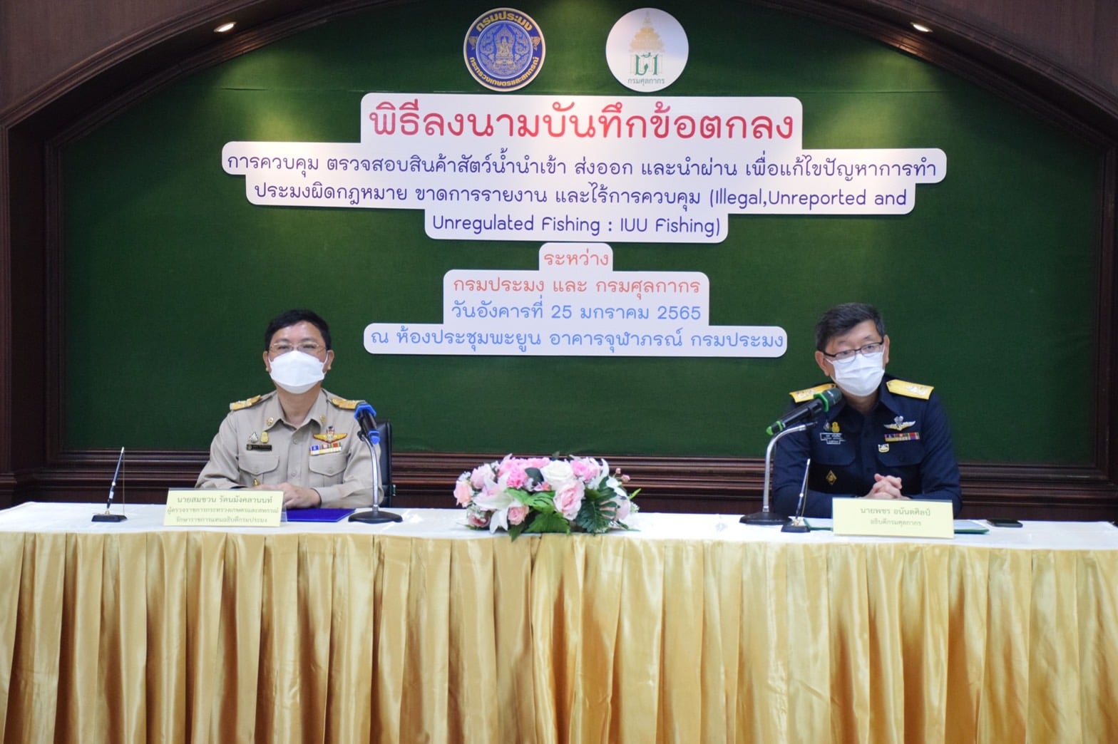 วันอังคารที่ 25 มกราคม พ.ศ. 2565 เวลา 10.00 น. ณ ห้องประชุมพะยูน อาคารจุฬาภรณ์ กรมประมง นายสมชวน รัตนมังคลานนท์ ผู้ตรวจราชการกระทรวงเกษตรและสหกรณ์ รักษาราชการแทนอธิบดีกรมประมง และ นายพชร อนันตศิลป์ อธิบดีกรมศุลกากร ร่วมลงนามในบันทึกข้อตกลง เรื่อง การควบคุม ตรวจสอบสินค้าสัตว์น้ำนำเข้า ส่งออก และนำผ่าน เพื่อยกระดับการดำเนินการแก้ไขปัญหาการทำประมงผิดกฎหมาย ขาดการรายงาน และไร้การควบคุม (IUU Fishing)