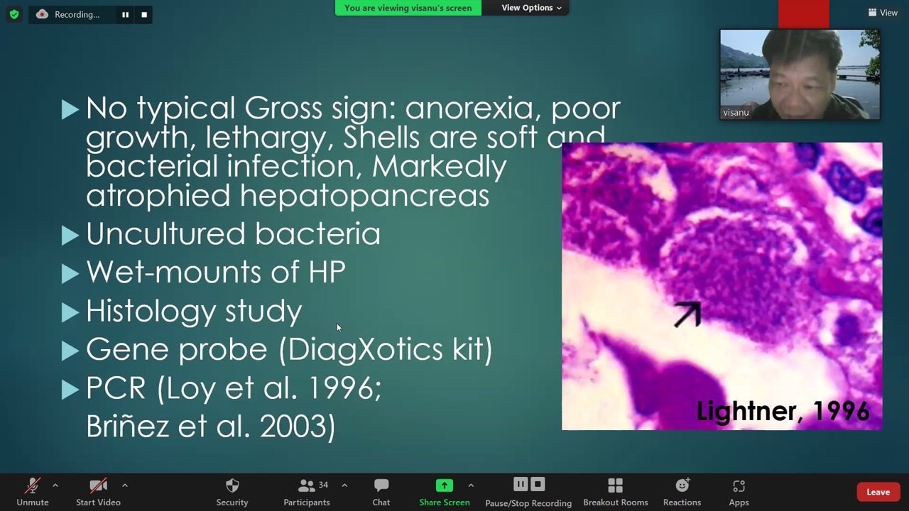 นางฐิติพร หลาวประเสริฐ ผู้อำนวยการกองวิจัยและพัฒนาสุขภาพสัตว์น้ำ เป็นประธานเปิดการฝึกอบรมหลักสูตร “การประยุกต์ใช้หลักทางระบาดวิทยาในการเฝ้าระวังโรคสัตว์น้ำ” ผ่านระบบออนไลน์โปรแกรม Zoom Cloud Meetings เพื่อให้ความรู้เรื่องระบาดวิทยาโรคสัตว์น้ำ และหลักการความปลอดภัยทางชีวภาพเพื่อการป้องกัน ควบคุมโรคสัตว์น้ำ สำหรับเตรียมความพร้อมบุคลากรในการดำเนินงานตามภารกิจเพื่อสนับสนุนนโยบายการฟื้นฟูผลผลิตกุ้งทะเล 400,000 ตัน ภายในปี 2566 ซึ่งได้รับเกียรติจาก รองศาสตราจารย์นายสัตวแพทย์ ดร.วิษณุ บุญญาวิวัฒน์ อาจารย์ประจำภาควิชาเวชศาสตร์และทรัพยากรการผลิตสัตว์ คณะสัตวแพทย์ศาสตร์ มหาวิทยาลัยเกษตรศาสตร์ เป็นวิทยากร