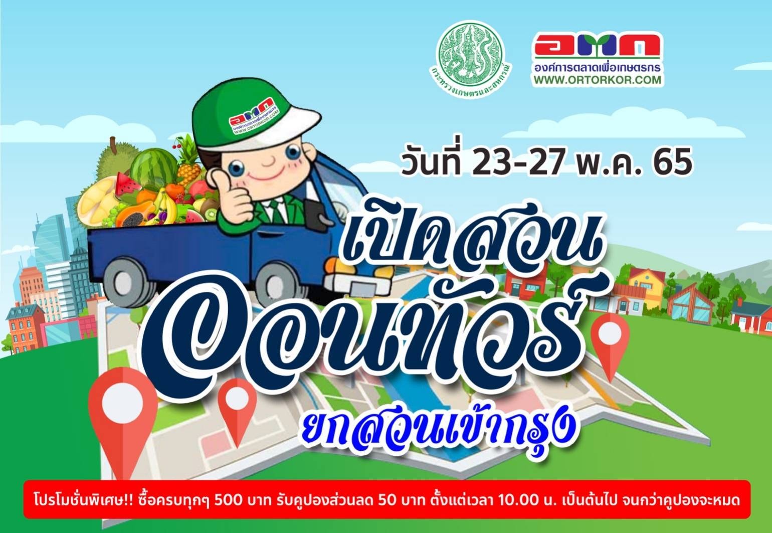 วันจันทร์ที่ 23 พฤษภาคม 2565 เวลา 09.00 น. ณ บริเวณลานโพธิ์ กรมประมงร่วมกับองค์การตลาดเพื่อเกษตรกร (อ.ต.ก.) จัดกิจกรรมกระจายสินค้าเกษตร "เปิดสวนออนทัวร์ ยกสวนเข้ากรุง" เพื่อช่วยเหลือเกษตรกรด้านการตลาดสินค้าเกษตร ด้วยผลผลิตที่มีคุณภาพ ส่งตรงจากเกษตรกร โดยมีการจำหน่ายสินค้าเกษตรแบบสดและแปรรูป อาทิ ผลไม้ตามฤดูกาล (ทุเรียน, ส้ม, ชมพู่, มังคุด) มะม่วงกวน, เม็ดมะม่วงเผา, ลูกหยีไร้เมล็ดฉาบ-บ๊วย ฯลฯ จากร้านค้าที่เข้าร่วมกิจกรรมนี้ อาทิ วิสาหกิจชุมชนกลุ่มแม่บ้านเกษตรกรเจริญผลพัฒนา จ.ชุมพร, วิสาหกิจชุมชนแปรรูปอาหารทะเลบ้านเขาเปาะ จ.พังงา, เกษตรกรผู้ปลูกทุเรียน จ.ระยอง โดยการจัดจำหน่ายสินค้าดังกล่าวกำหนดจัดขึ้น ตั้งแต่วันที่ 23 - 27 พฤษภาคม 2565 เวลา 09.00 น. - 15.00 น. ณ บริเวณลานโพธิ์ กรมประมง ม.เกษตรศาสตร์ บางเขน กรุงเทพฯ