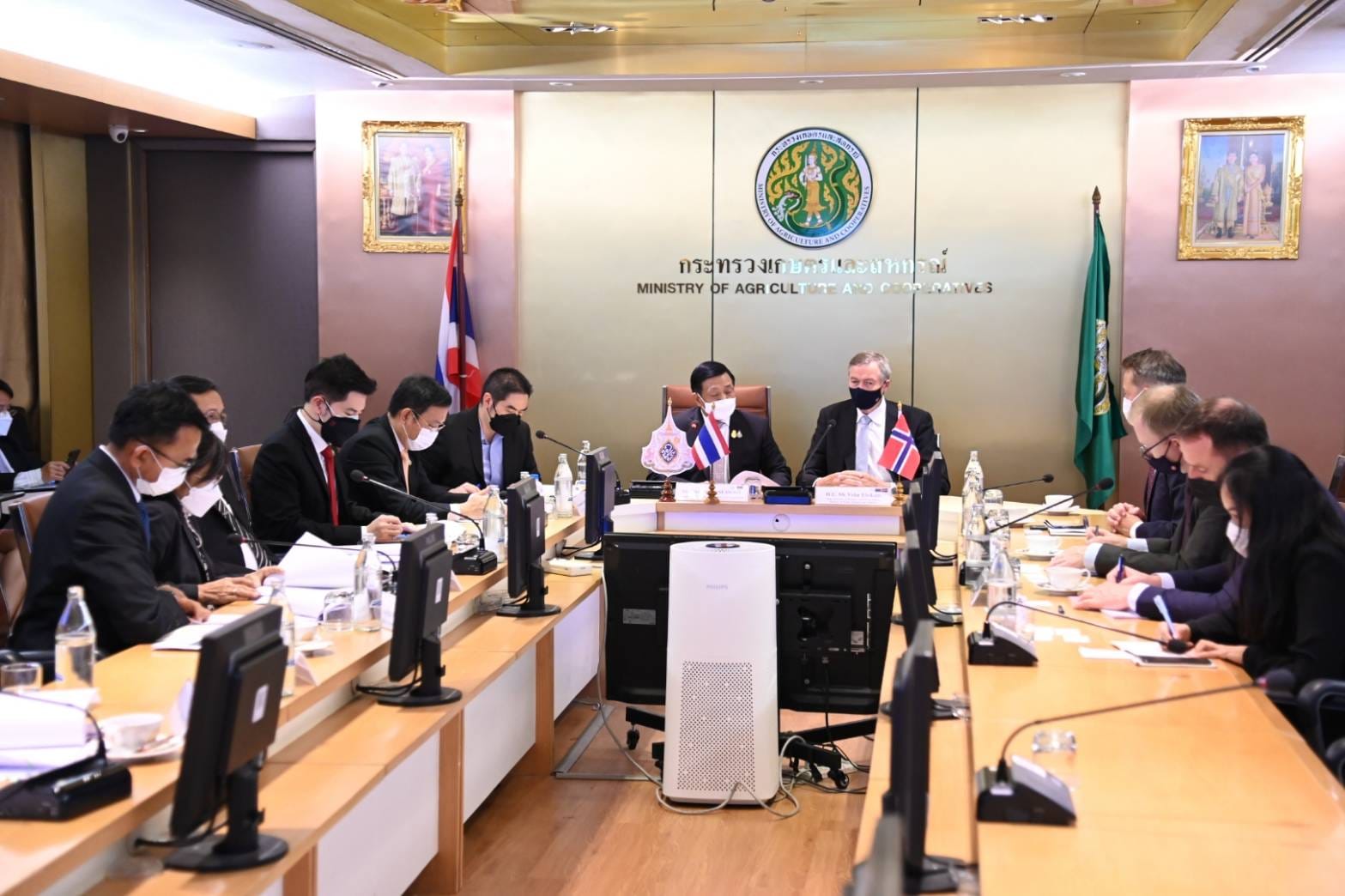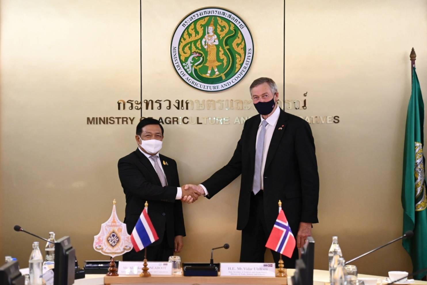 นายเฉลิมชัย สุวรรณรักษ์ อธิบดีกรมประมง พร้อมด้วย นางชวนพิศ จันทวราทิตย์ ผู้เชี่ยวชาญด้านที่ปรึกษาการประมงต่างประเทศ นายชลธิศักดิ์ ชาวปากน้ำ ผู้อำนวยการกองประมงต่างประเทศ และนักวิชาการประมง เข้าร่วมการประชุมหารือกับรองรัฐมนตรีด้านการประมงและนโยบายทางทะเล กระทรวงการค้า อุตสาหกรรม และการประมง ราชอาณาจักรนอร์เวย์ ในการสนับสนุนในหลักการของปฏิญญาโคเปนเฮเกน (Copenhegen Declaration) และข้อริเริ่มความยุติธรรมสีน้ำเงิน (Blue Justice Initiative) โดยมี นายอลงกรณ์ พลบุตร ที่ปรึกษารัฐมนตรีว่าการกระทรวงเกษตรและสหกรณ์ พร้อมด้วย นายสมชวน รัตนมังคลานนท์ รองปลัดกระทรวงเกษตรและสหกรณ์ ให้การต้อนรับ ฯพณฯ วิดาร์ อุลริกเซน รองรัฐมนตรีด้านการประมงและนโยบายทางทะเล กระทรวงการค้า อุตสาหกรรม และการประมง ราชอาณาจักรนอร์เวย์ และคณะ
