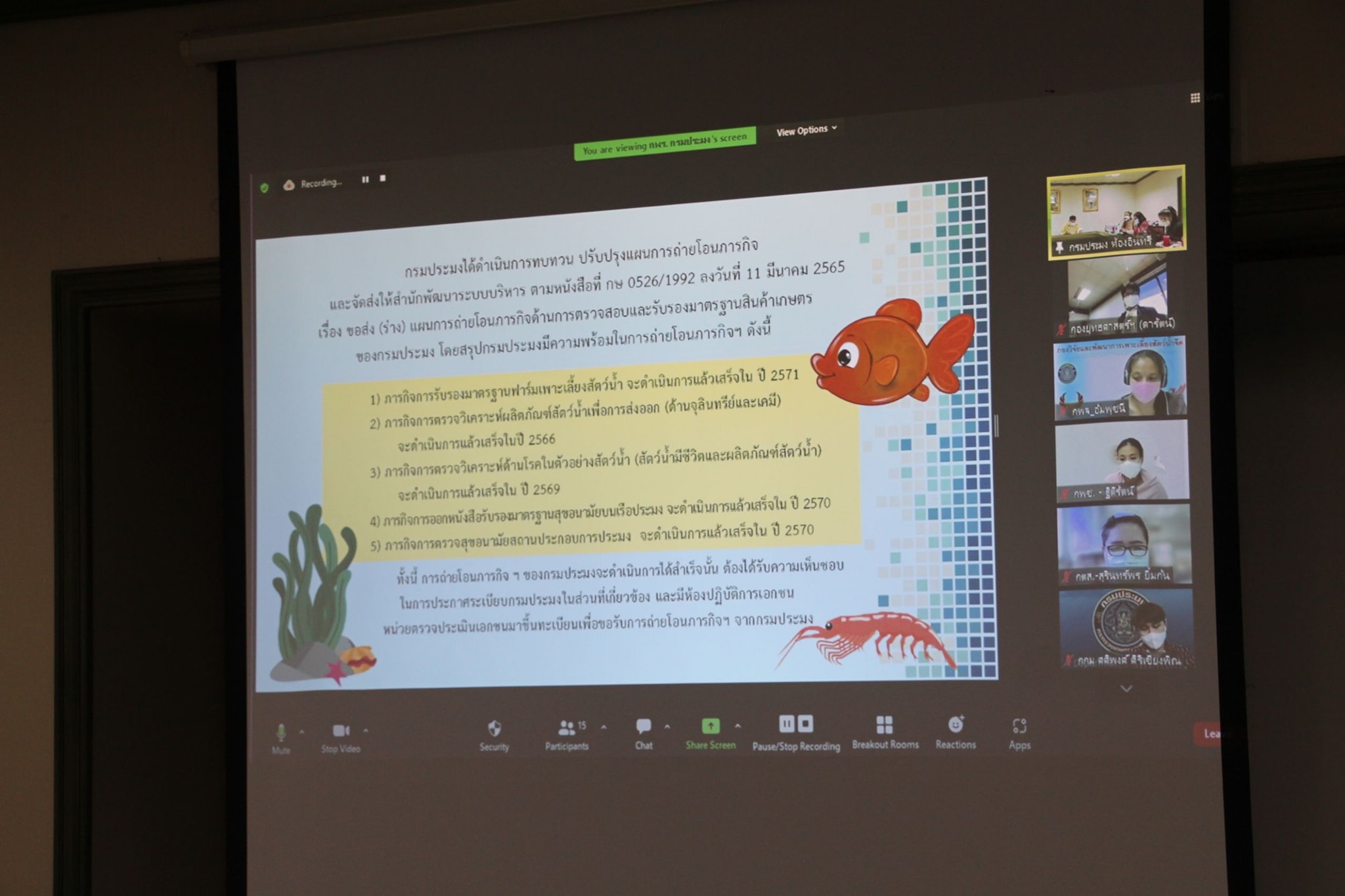 นายถาวร ทันใจ รองอธิบดีกรมประมง เป็นประธานในการประชุมคณะทำงานทบทวนบทบาทภารกิจการถ่ายโอนการตรวจสอบและรับรองมาตรฐานของกรมประมง ครั้งที่ 1/2565