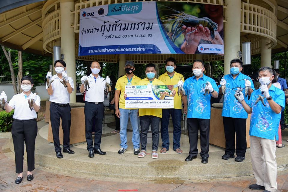 วันอาทิตย์ที่ 7 มิถุนายน 2563 ณ สถานีบริการน้ำมันพีทีที สเตชั่น ถนนวิภาวดีรังสิต แขวงสามเสนเขตพญาไท กรุงเทพมหานคร นายมีศักดิ์ ภักดีคง อธิบดีกรมประมง นายถาวร จิระโสภณรักษ์ รองอธิบดีกรมประมง นายบัญชา สุขแก้ว รองอธิบดีกรมประมง พร้อมด้วย นายบุญมา พนธนกรกุล รองกรรมการผู้จัดการใหญ่ธุรกิจค้า ปลีกน้ำมัน บริษัท ปตท. น้ำมันและการค้าปลีก จำกัด (มหาชน) นางพรรณวดี พุฒยางกูร ผู้จัดการฝ่ายการตลาดค้าปลีกน้ำมัน นายพีระวัฒน์ วชิโรภาสนันท์ ผู้จัดการฝ่ายบริหารสถานีบริการส่วนกลาง ร่วมประชาสัมพันธ์กิจกรรมการจำหน่ายกุ้งก้ามกรามกลางกรุง @PTT Station เพื่อช่วยเกษตรกรหลังประสบปัญหาราคาผลผลิตตกต่ำจากวิกฤตโควิด-19 ให้สามารถส่งถึงมือผู้บริโภคได้โดยตรง ไม่ต้องผ่านพ่อค้าคนกลาง ในบริเวณของสถานีบริการน้ำมัน พีทีที สเตชั่น ในเขตกรุงเทพมหานคร ซึ่งเป็นทำเลที่มีประชาชนสัญจรอย่างคับคั่ง จำนวน 4 แห่ง ประกอบด้วย จุดที่ 1 พีทีที สเตชั่น สวัสดิการ ถนนวิภาวดีรังสิต จุดที่ 2 พีทีที สเตชั่น ประชาอุทิศ-ลาดพร้าว จุดที่ 3 พีทีที สเตชั่น เทพรักษ์ และจุดที่ 4 พีทีที