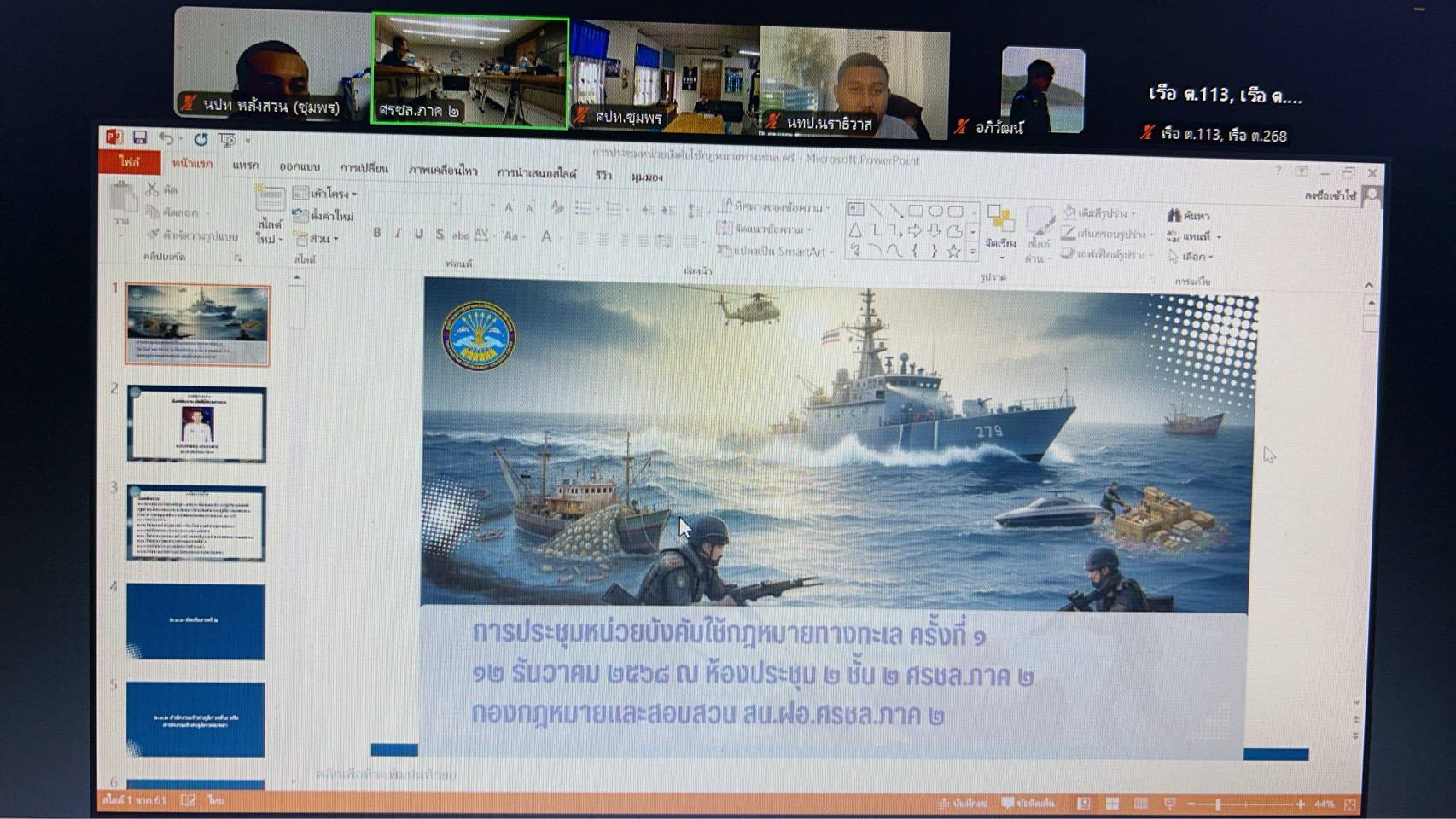 วันที่ 12 ธันวาคม 2568 หน่วยป้องกันและปราบปรามประมงทะเลหลังสวน (ชุมพร) ศูนย์ป้องกันและปราบปรามประมงทะเลชุมพร กองตรวจการประมง กรมประมง โดยนายนุรัตน์ ขาวสอาด หัวหน้า นปท.หลังสวน (ชุมพร) มอบหมายให้นายจักรพันธ์ ขาวสุวรรณ เจ้าพนักงานประมงชำนาญงาน ได้เข้าร่วมประชุมหน่วยบังคับใช้กฎหมายทางทะเล ครั้งที่ 1 โดยมีวัตถุประสงค์เพื่อพัฒนาขีดความสามารถพนักงานเจ้าหน้าที่ ศรชล. ในการสนับสนุนการปฏิบัติงานตอบสนองต่อภัยคุกคามทางทะเล 9 ด้าน และการบังคับใช้กฎหมายที่เกี่ยวข้องกับการรักษาผลประโยชน์ของชาติทางทะเล ในพื้นที่รับผิดชอบของ ศรชล.ภาค 2 ณ ห้องประชุม 2 ชั้น 2 ศรชล.ภาค2 ผ่านระบบโปรแกรม Zoom Meeting โดยมี พล.ร.ต.พิสิษฐ์ จตุรัสกรพัฒน์ ผอ.สน.ฝอ.ศรชล.ภาค 2 เป็นประธานในที่ประชุม