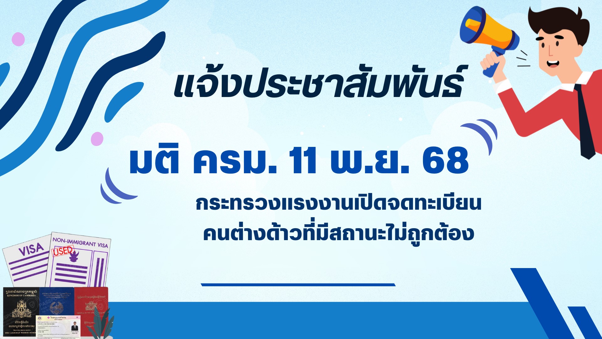 ประชาสัมพันธ์ เรื่อง การบริหารจัดการการทำงานของคนต่างด้าวที่มีสถานะไม่ถูกต้องตามกฎหมาย สำหรับคนต่างด้าว 3 สัญชาติ (ลาว เมียนมา และเวียดนาม)