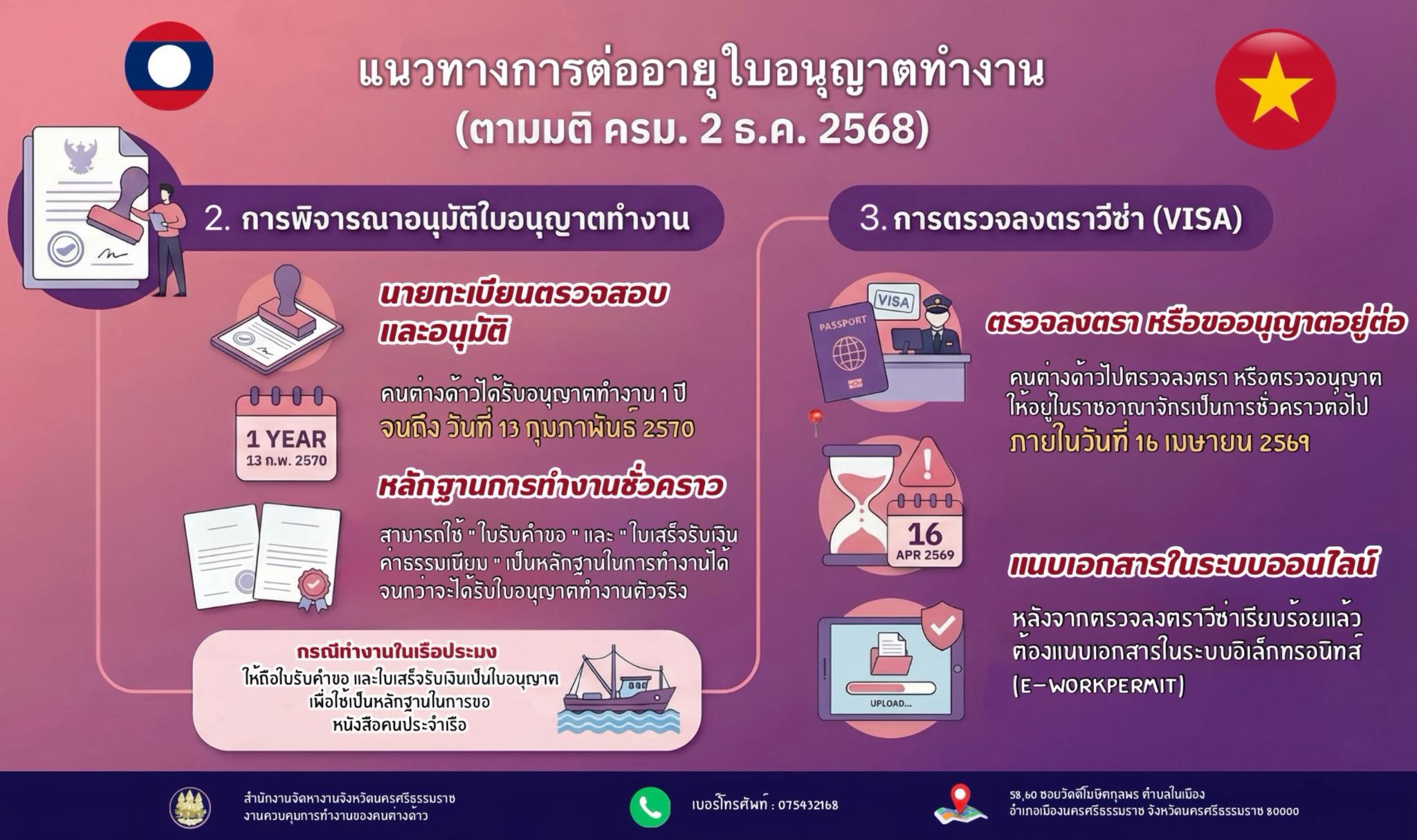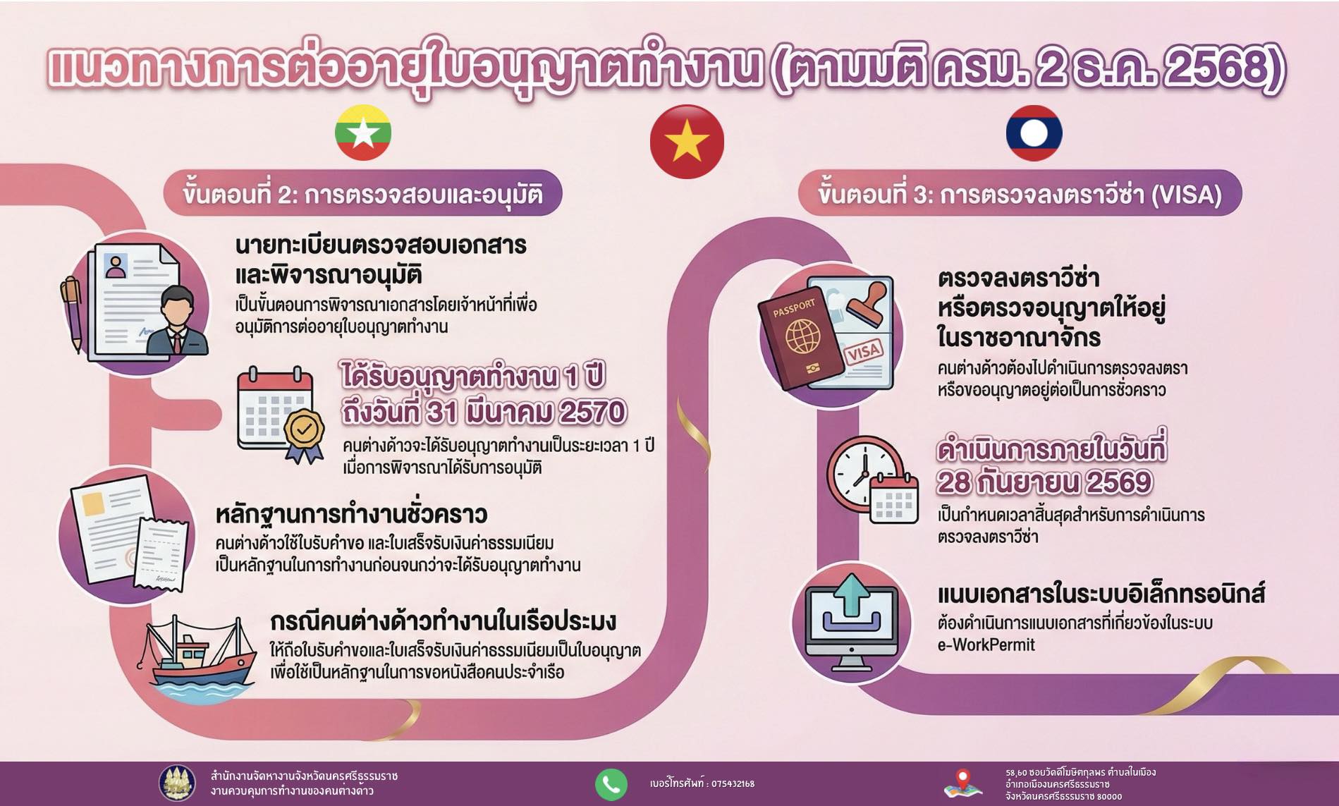 แนวทางการต่ออายุใบอนุญาตทำงานตามมติ ครม. เมื่อวันที่ 2 ธันวาคม 2568 ให้กับคนต่างด้าวสัญชาติลาว เมียนมา และเวียดนาม