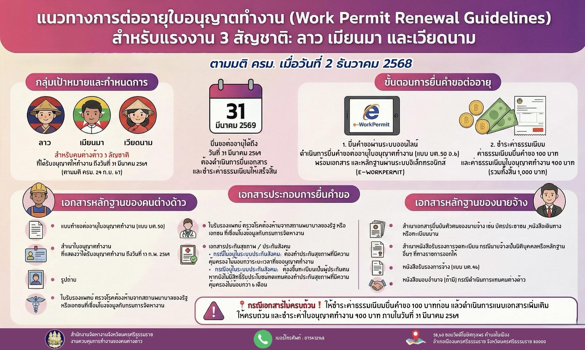 แนวทางการต่ออายุใบอนุญาตทำงานตามมติ ครม. เมื่อวันที่ 2 ธันวาคม 2568 ให้กับคนต่างด้าวสัญชาติลาว เมียนมา และเวียดนาม ที่ได้รับอนุญาตทำงานตามมติ ครม. เมื่อวันที่ 24 กันยายน 2567 และวันที่ 4 กุมภาพันธ์ 2568