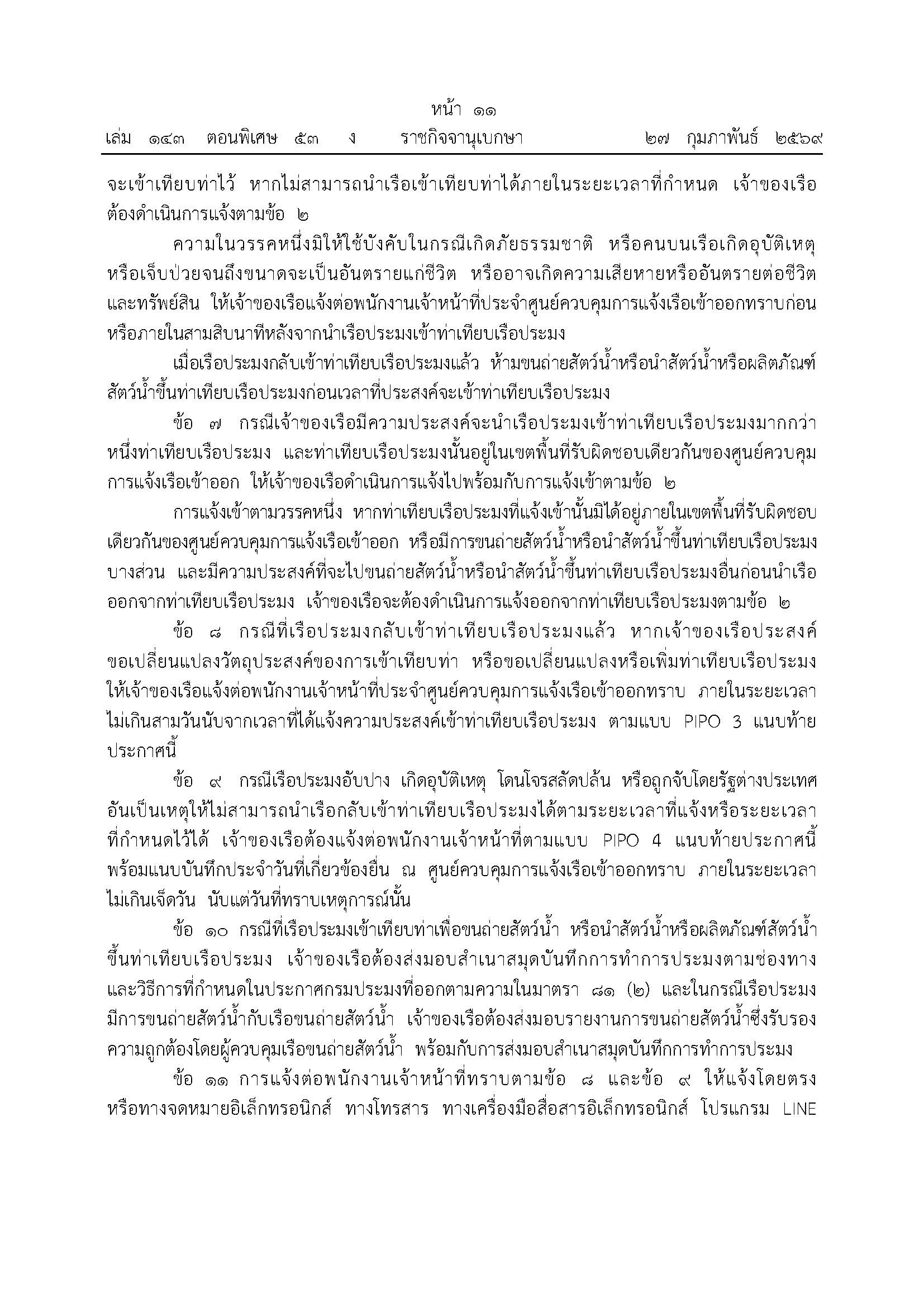 ประกาศกรมประมง เรื่อง กำหนดหลักเกณฑ์และวิธีการเกี่ยวกับการแจ้งการเข้าออกท่าเทียบเรือประมงของเรือประมงพาณิชย์ พ.ศ. ๒๕๖๙