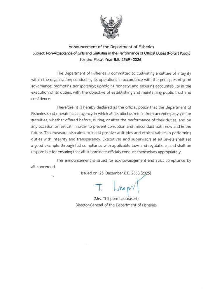 กรมประมงประกาศเจตนารมณ์ No Gift Policy ไม่รับของขวัญและของกำนัลทุกชนิดจากการปฏิบัติหน้าที่ ประจำปีงบประมาณ พ.ศ. 2569 เพื่อเสริมสร้างค่านิยมด้านความซื่อสัตย์สุจริต ความประหยัด สร้างทัศนคติที่ถูกต้อง และป้องกันการเกิดผลประโยชน์ทับซ้อน อันอาจนำไปสู่การทุจริตในภาครัฐ