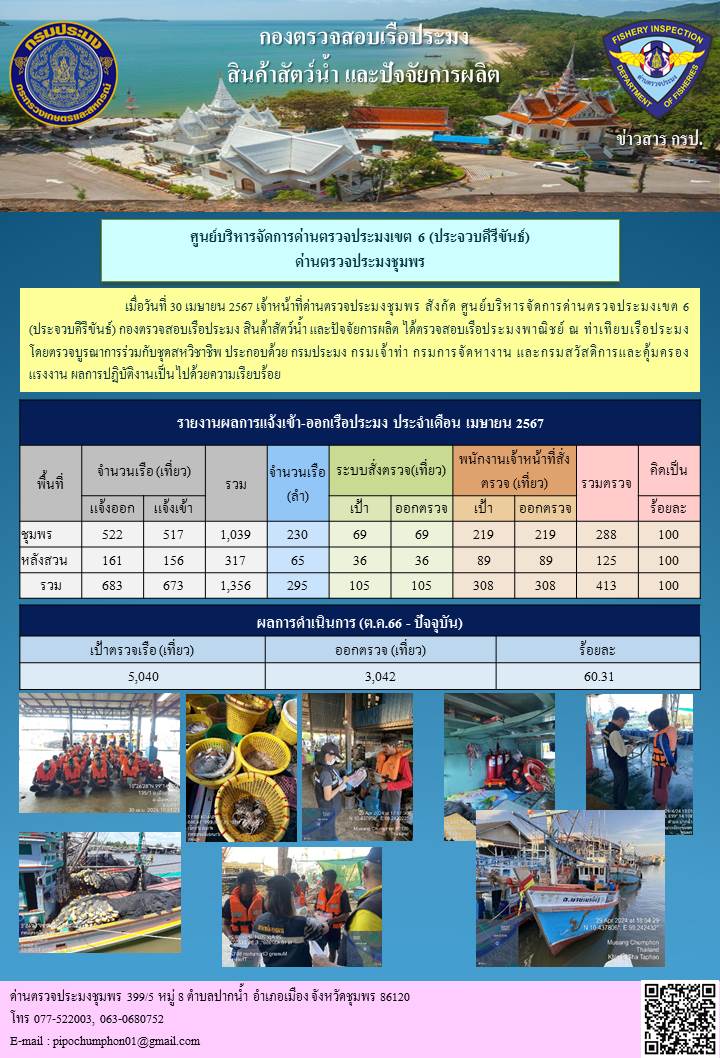 ข้อมูลสถิติการแจ้งเรือเข้า-ออก ประจำเดือนเมษายน 2567 และข้อมูลสถิติการแจ้งเรือเข้า-ออกตั้งแต่เดือนตุลาคม 2565 -เดือนกันยายน 2566  รวมถึงรายงานประจำเดือนเมษายน 2567 เจ้าหน้าที่ด่านตรวจประมงชุมพร สังกัด ศูนย์บริหารจัดการด่าน ตรวจประมงเขต 6 (ประจวบคีรีขันธ์) กองตรวจสอบเรือประมง สินค้าสัตว์น้ำ และปัจจัยการผลิต ได้ตรวจสอบ  เรือประมงพาณิชย์ ณ ท่าเทียบเรือประมง โดยตรวจบูรณาการร่วมกับชุดสหวิชาชีพ ประกอบด้วย กรมประมง กรมเจ้าท่า กรมการจัดหางาน และกรมสวัสดิการและคุ้มครองแรงงาน  ผลการปฏิบัติงานเป็นไปด้วยความเรียบร้อย