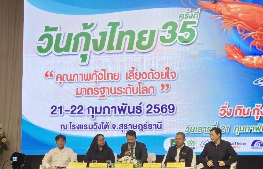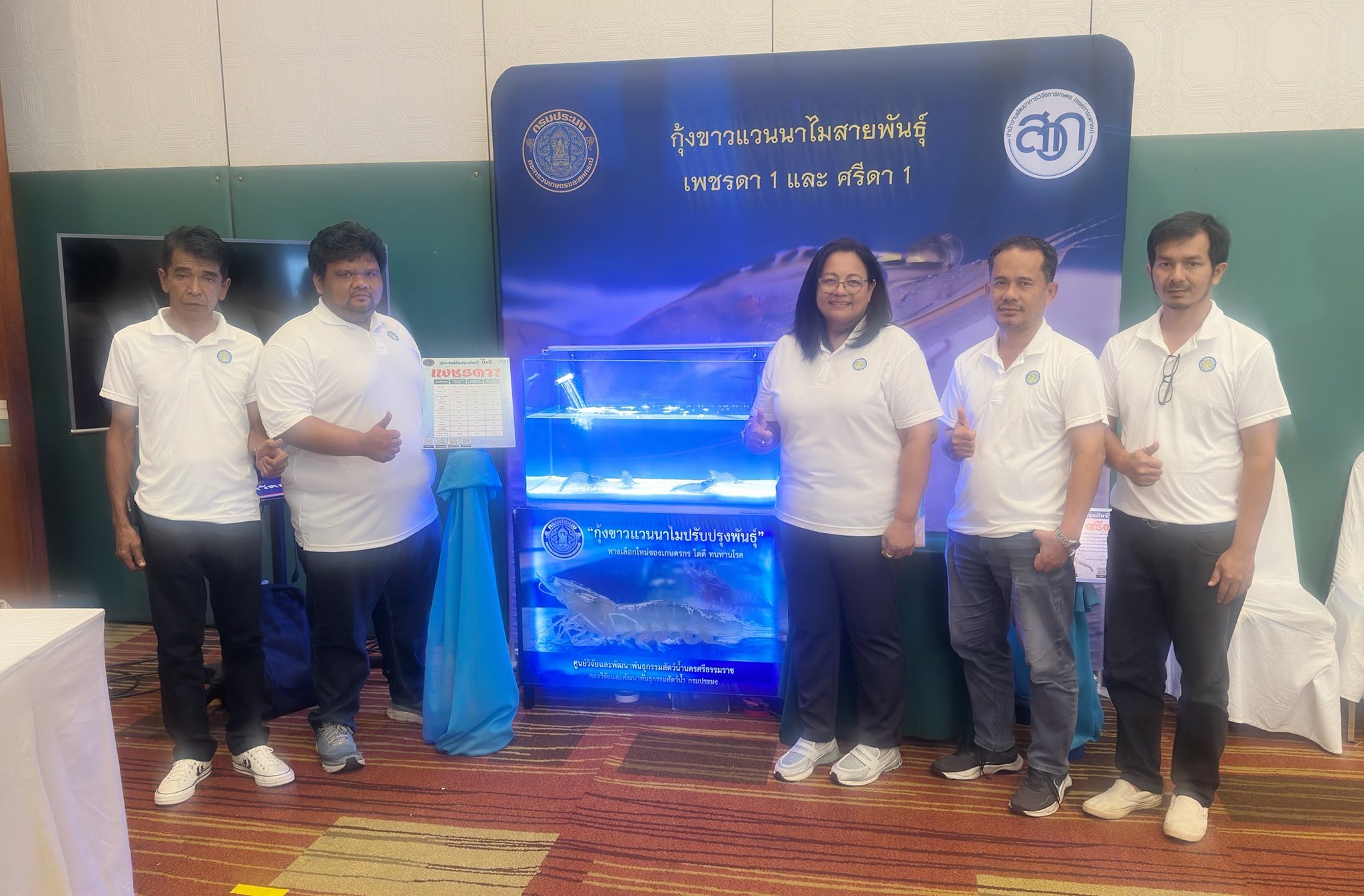 วันที่ 21 - 22 กุมภาพันธ์ 2569 นางสิริวรรณ หนูเซ่ง ผู้อำนวยการศูนย์วิจัยและพัฒนาพันธุกรรมสัตว์น้ำนครศรีธรรมราช ร่วมเสวนาวิชาการในงานวันกุ้งไทย ครั้งที่ 35 ในหัวข้อ “วิสัยทัศน์ สายพันธุ์ มุ่งมั่นเพื่อกุ้งไทย” พร้อมด้วยเจ้าหน้าที่ของศูนย์ฯ นำกุ้งขาวแวนนาไมปรับปรุงพันธุ์ “ศรีดา 1” และ “เพชรดา 1” ร่วมจัดนิทรรศการ ณ โรงแรมวังใต้ จังหวัดสุราษฎร์ธานี
