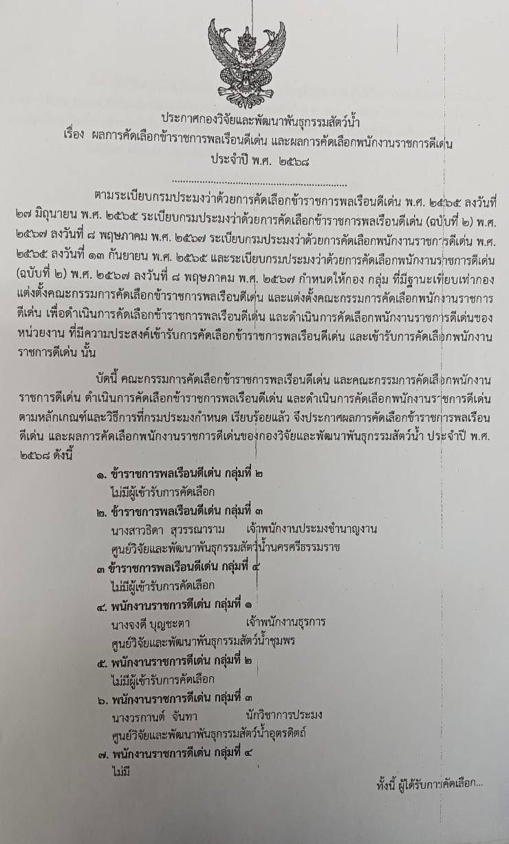NEW ขอแสดงความยินดีกับ นางสาวธิดา สุวรรณาราม เจ้าพนักงานประมงชำนาญงาน เนื่องในโอกาสได้รับการคัดเลือกข้าราชการพลเรือนดีเด่น ระดับกองวิจัยและพัฒนาพันธุกรรมสัตว์น้ำ กลุ่มที่ 3 ประจำปี พ.ศ. 2568..คลิก