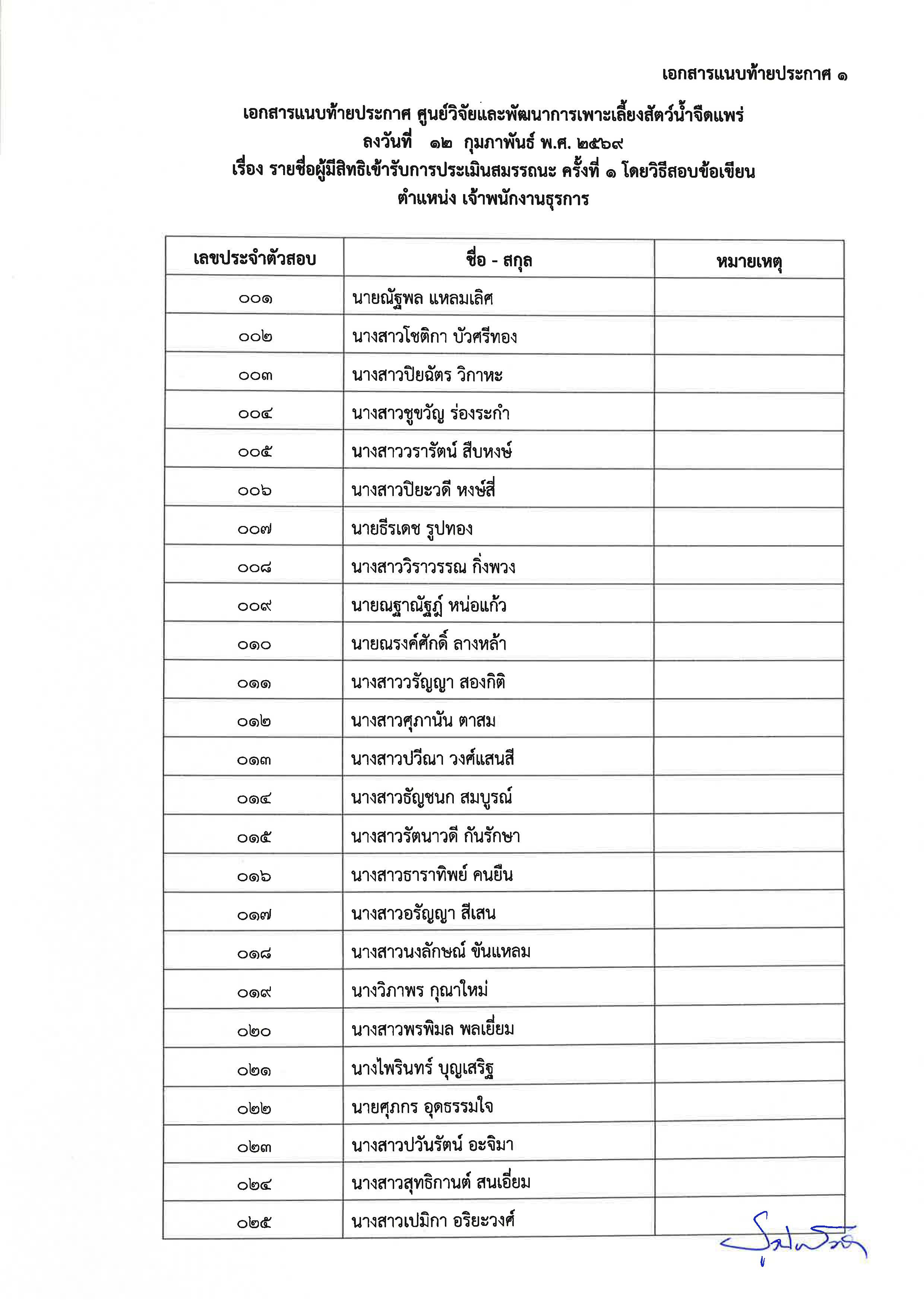 ประกาศ รายชื่อผู้มีสิทธิเข้ารับการประเมินสมรรถนะเพื่อเลือกสรรบุคคลเป็นพนักงานราชการทั่วไป ตำแหน่ง เจ้าพนักงานธุรการ