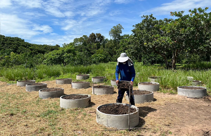 -การปลูกหญ้าแฝกรอบทรงพุ่มมะม่วง เพื่อรักษาความชื้นในดินทราย และใส่ปุ๋ยอินทรีย์คุณภาพสูง บำรุงต้น และใบ เพื่อผลิตมะม่วงคุณภาพ