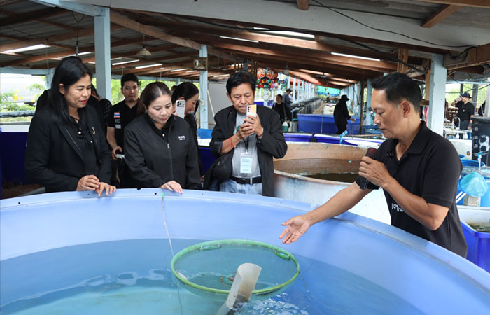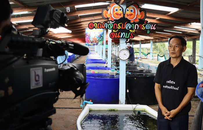 จากนั้น คณะสื่อมวลชนได้เดินทางไปเยี่ยมชม ศูนย์เรียนรู้ตามแนวพระราชดำริ “การเพาะเลี้ยงสัตว์น้ำชายฝั่ง” ของ นายอำนวย วงศ์วารี โดยได้บรรยายถึง จุดเริ่มต้นของการจัดตั้งศูนย์เรียนรู้ฯ ว่าเกิดจากการนำองค์ความรู้และประสบการณ์ที่ได้รับขณะปฏิบัติงานที่ศูนย์ฯ มาปรับใช้ในการประกอบอาชีพเสริม โดยเริ่มจากการทดลองเพาะเลี้ยง ปลาการ์ตูน โดยมีการศึกษาและพัฒนาอย่างต่อเนื่อง จนทำให้ปัจจุบันมีการเพาะเลี้ยงปลาการ์ตูนมากกว่า 10 สายพันธุ์ รวมถึงการเพาะพันธุ์สัตว์น้ำชายฝั่งเศรษฐกิจชนิดอื่นร่วมด้วย เช่น ปลากะพงขาว ปลานิลแดงทนเค็ม หอยหวาน ปูม้า และปูแป้น เป็นต้น ซึ่งเป็นสร้างภูมิคุ้มกันในเรื่องรายได้ให้กับฟาร์ม เช่น กรณีสัตว์น้ำที่เคยได้รับความนิยม อาจมีความต้องการลดลง ก็จะมีสัตว์น้ำตัวอื่นเข้ามาทดแทนอย่างต่อเนื่อง จากความสำเร็จดังกล่าว ในปี พ.ศ. 2567 ได้รับการคัดเลือกให้เป็น “ศูนย์เรียนรู้ตามแนวพระราชดำริด้านการเพาะเลี้ยงสัตว์น้ำชายฝั่ง” จากสำนักงาน กปร. พร้อมจัดตั้งเป็น “ธนาคารปูม้า” เพื่อเป็นต้นแบบในการเพาะเลี้ยงควบคู่กับการอนุรักษ์ทรัพยากรทางทะเลอย่างยั่งยืน