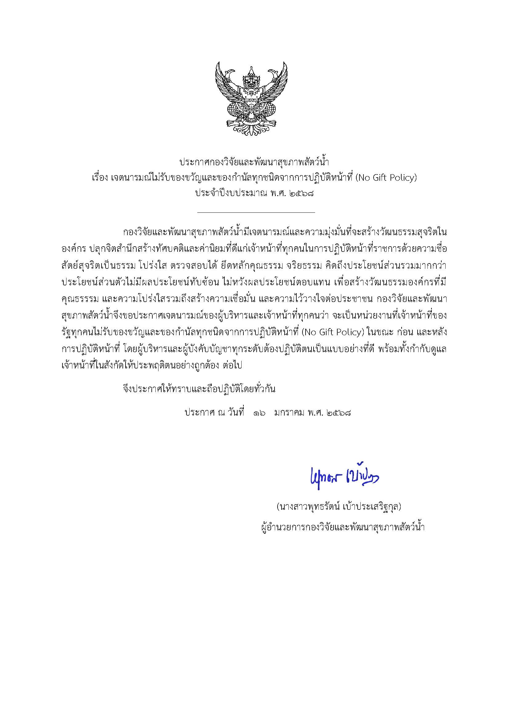 กองวิจัยและพัฒนาสุขภาพสัตว์น้ำ ประกาศเจตนารมณ์ไม่รับของขวัญและของกำนัลทุกชนิดจากการปฏิบัติหน้าที่ (No Gift Policy) ประจำปีงบประมาณ พ.ศ. 2568..คลิก