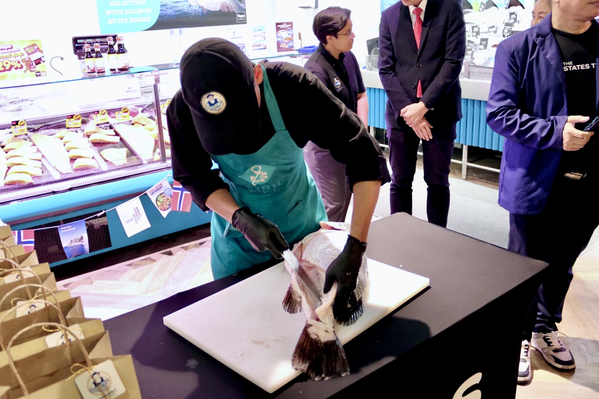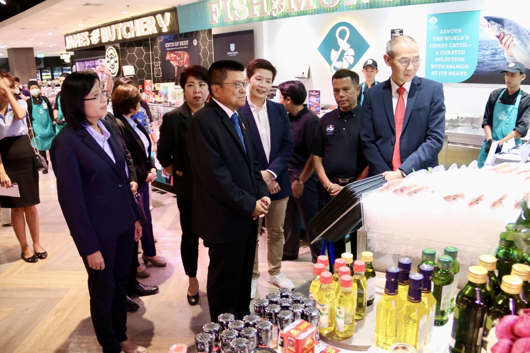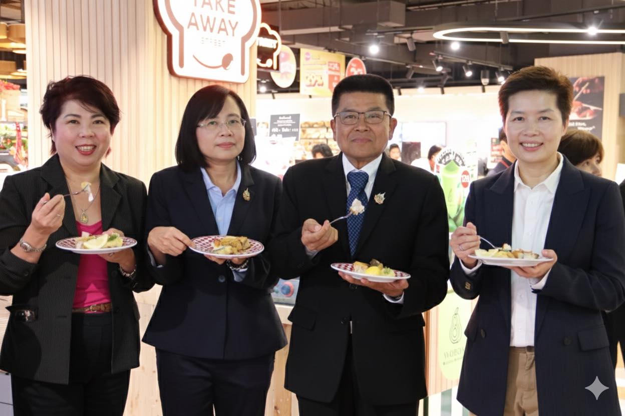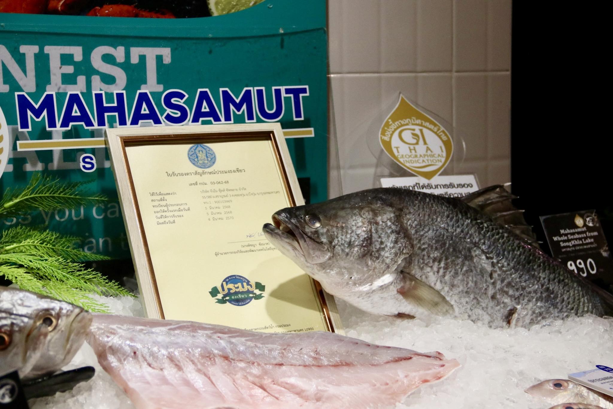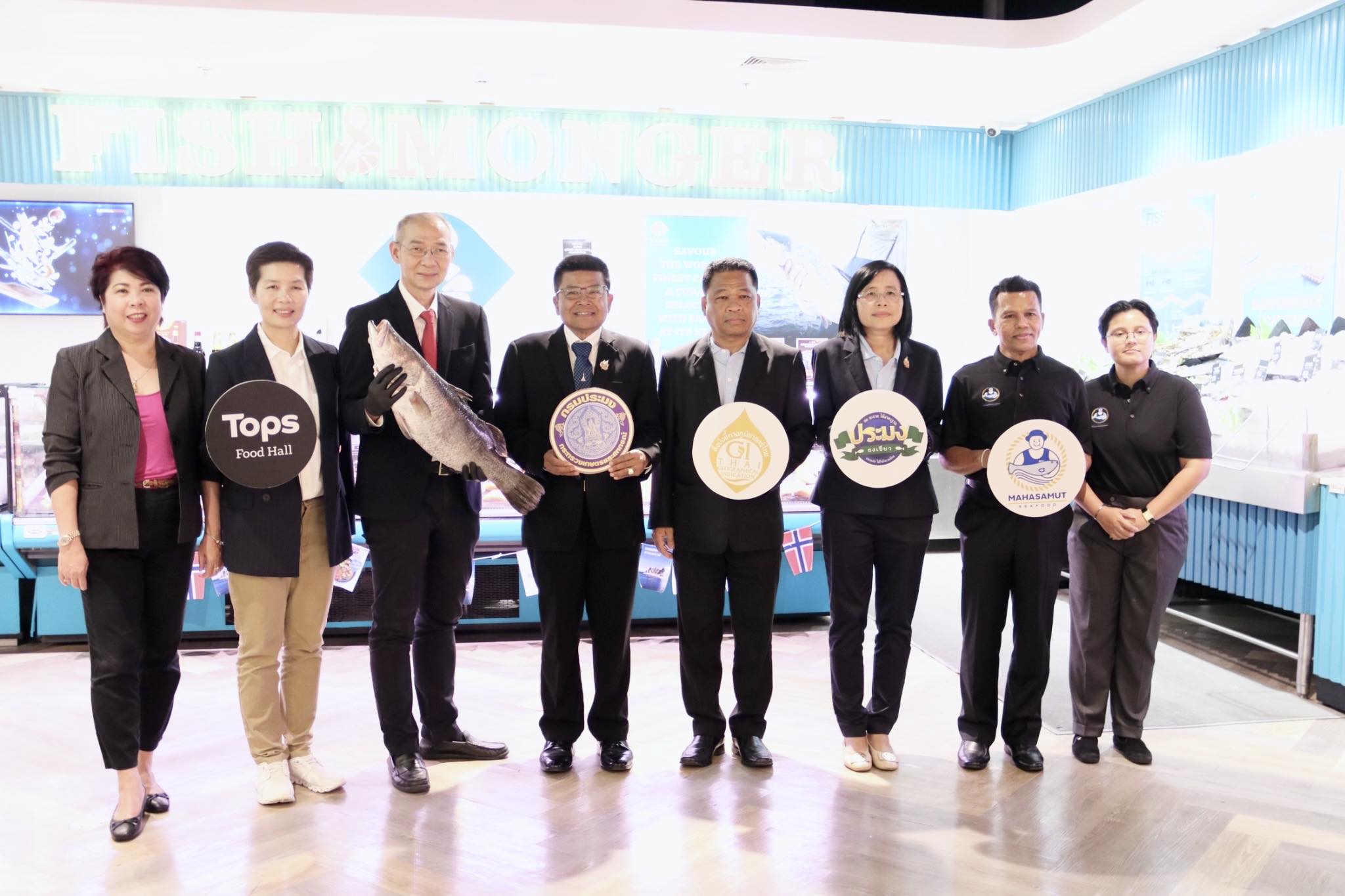 วันพฤหัสบดีที่ 11 กันยายน 2568 เวลา 16.30 น. นายบัญชา สุขแก้ว อธิบดีกรมประมง เยี่ยมชมร้านมหาสมุทรซีฟู๊ดส์ ร้านจำหน่ายปลากะพงสามน้ำจากทะเลสาบสงขลา ตำบลเกาะยอ จังหวัดสงขลา ในโอกาสเปิดตัวการส่งเสริมการตลาด “ปลากะพงสามน้ำทะเลสาบสงขลา” สินค้า GI จากจังหวัดสงขลา โอกาสนี้ อธิบดีกรมประมง ชมการแล่ปลากะพงสามน้ำด้วยเทคนิคอิเคะจิเมะ และร่วมชิมสเต๊กปลากะพงสามน้ำ พร้อมทั้งมอบใบรับรองตราสัญลักษณ์ประมงธงเขียวให้กับร้านมหาสมุทรซีฟู๊ดส์ โดยมี นายอำนวย คงพรหม ผู้ตรวจราชการกรม นางพิชญา ชัยนาค ผู้อำนวยการกองวิจัยและพัฒนาเทคโนโลยีอุตสาหกรรมสัตว์น้ำ นางสาวมนทกานติ ท้ามติ้น ผู้อำนวยการกองวิจัยและพัฒนาการเพาะเลี้ยงสัตว์น้ำชายฝั่ง ผู้บริหาร บริษัท ทีเอ็ม ฟู๊ดส์ ซัพพลาย จำกัด และเจ้าหน้าที่ที่เกี่ยวข้อง เข้าร่วม ณ Tops Food Hall ศูนย์การค้าเซ็นทรัล พระราม 9 กรุงเทพฯ