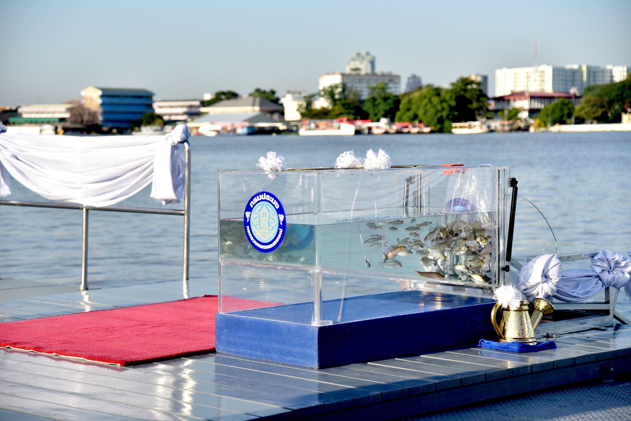 สำหรับพันธุ์สัตว์น้ำที่กรมประมงถวายเป็นพันธุ์ปลาไทย จำนวน ๙ ชนิด ประกอบด้วย ปลาตะเพียนขาว ปลาตะเพียนทอง ปลายี่สกไทย ปลาแก้มช้ำ ปลาสร้อยขาว ปลากระแห ปลาโพง ปลาเทพา และปลาชะโอน รวม ๔๙๐,๐๐๐ ตัว ปล่อยลงสู่แม่น้ำเจ้าพระยา เป็นการเพิ่มผลผลิตสัตว์น้ำ และรักษาระบบนิเวศให้มีความอุดมสมบูรณ์