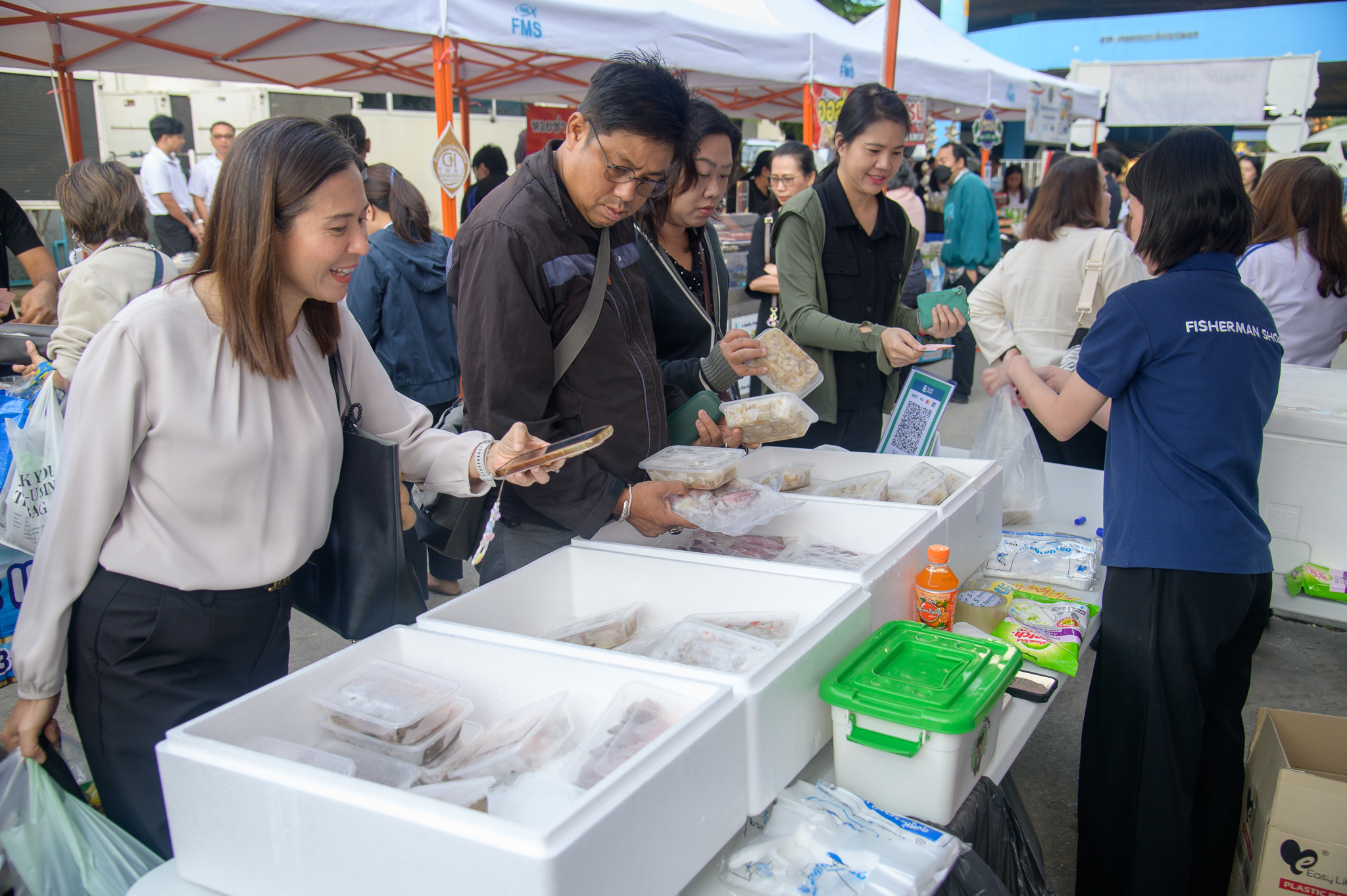 ภายในงานมีการจำหน่ายสินค้า อาทิ กุ้งอบซอส ผัดหมี่กุ้งโพหัก ฉู่ฉี่กุ้ง จากสหกรณ์ประมงบางแพ จังหวัดราชบุรี  ปลาทู GI จากวิสาหกิจชุมชน เติ้ล & ตั้มปลาทูโป๊ะ จังหวัดสมุทรสงคราม รวมถึงสินค้าจากร้าน Fisherman Shop @ Bangkhen ซึ่งเป็นแหล่งรวบรวมสินค้าเกษตรมูลค่าสูง และสินค้าประมงชายแดน เพื่อช่วยสนับสนุนการกระจายสินค้าประมงสู่ผู้บริโภค และเพิ่มรายได้ให้แก่กลุ่มเกษตรกร ผู้แปรรูปสินค้าประมง