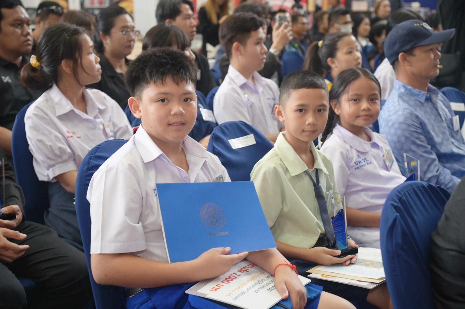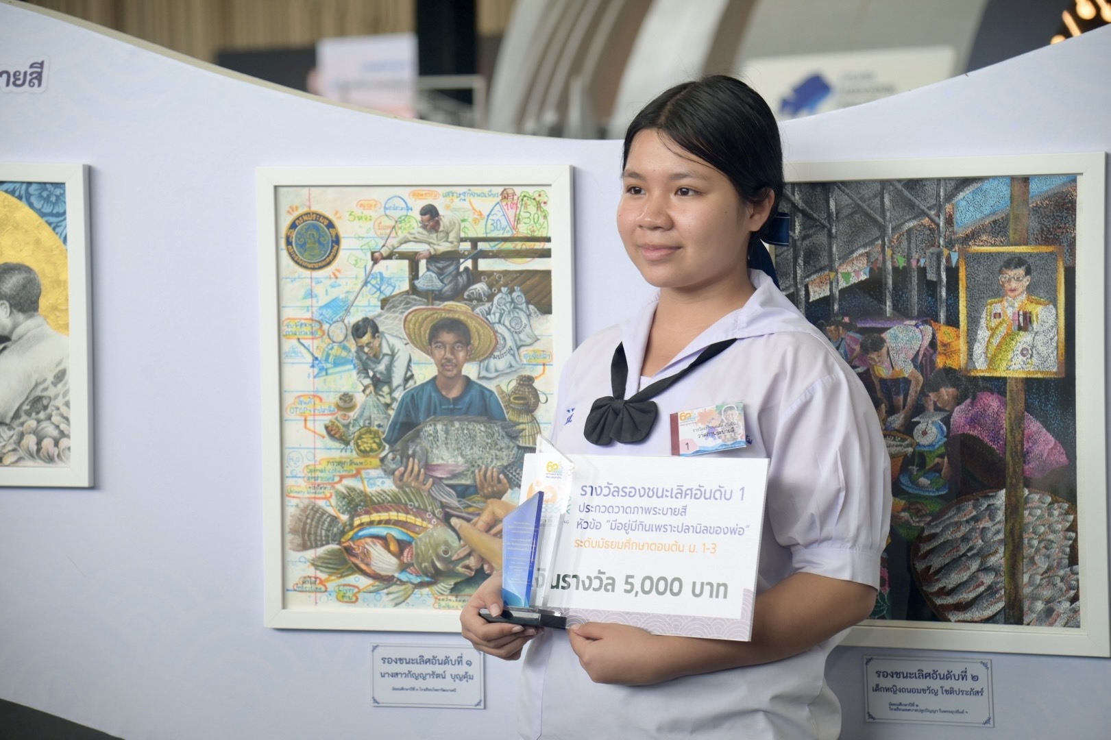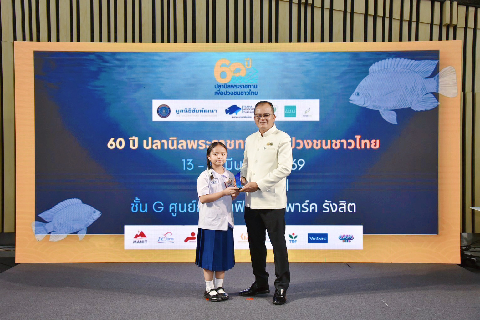 รองอธิบดีกรมประมง มอบโล่รางวัลและประกาศนียบัตรการประกวดภาพถ่าย การประกวดวาดภาพระบายสี พร้อมมอบป้ายสนับสนุนพันธุ์ปลานิลให้แก่ตัวแทนโรงเรียน ในงาน 60 ปี ปลานิลพระราชทานเพื่อปวงชนชาวไทย
