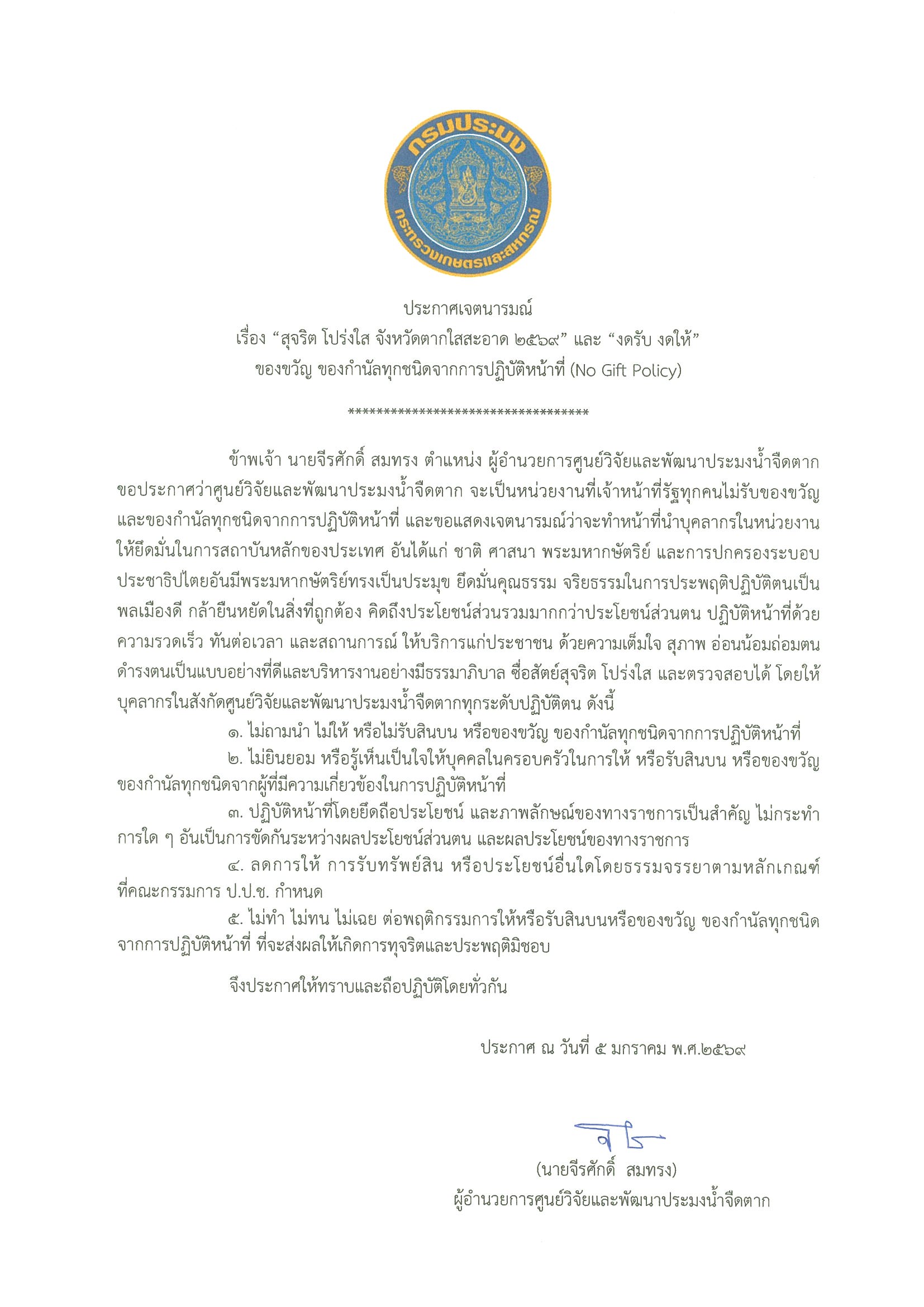 ประกาศเจตนารมณ์ เรื่อง "สุจริต โปร่งใส จังหวัดตากใสสะอาด ๒๕๖๙" และ "งดรับ งดให้" ของขวัญ ของกำนัลทุกชนิดจากการปฏิบัติหน้าที่ (No Gift Policy)