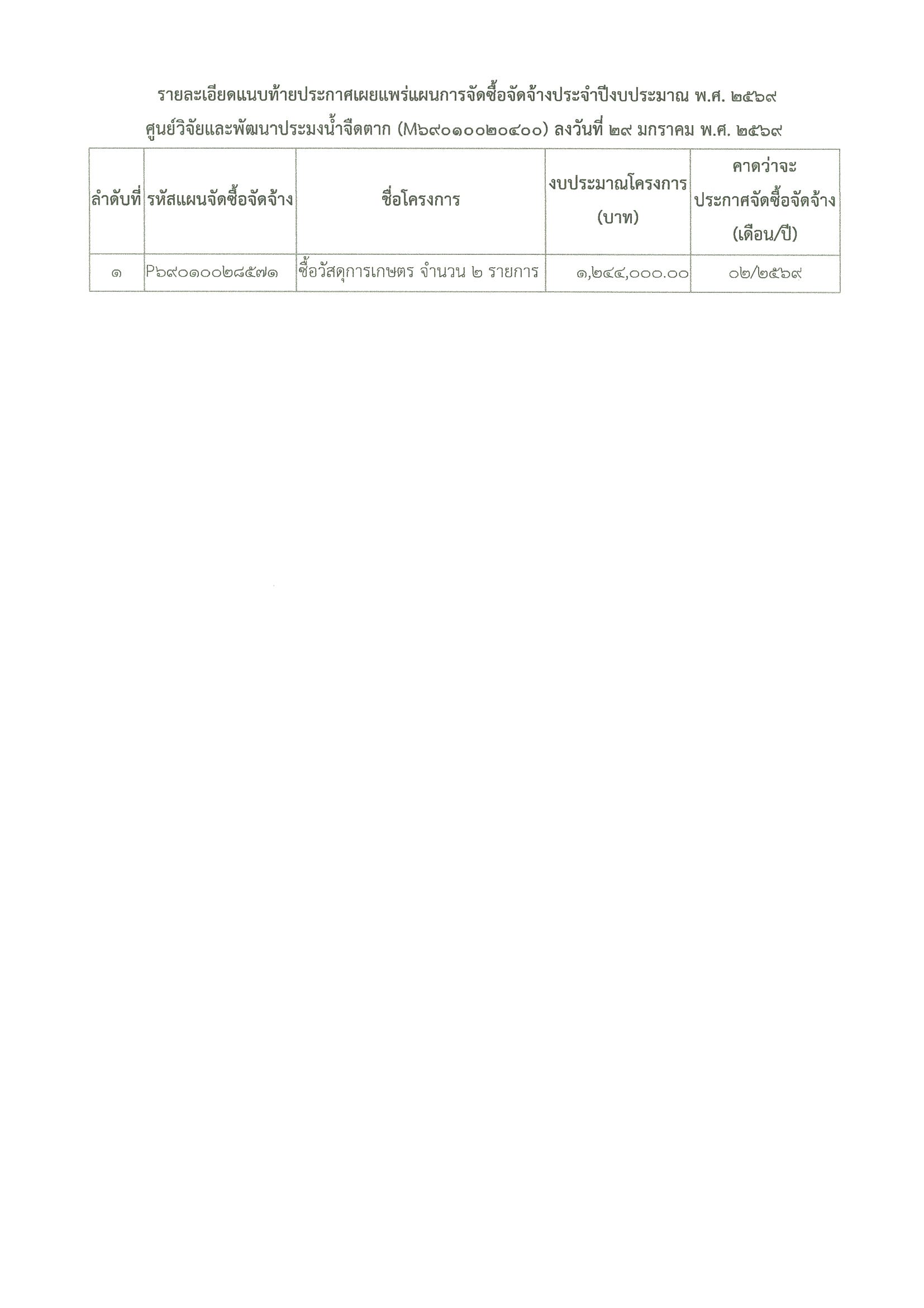 ประกาศศูนย์วิจัยและพัฒนาประมงน้ำจืดตาก เรื่อง เผยแพร่แผนการจัดซื้อจัดจ้าง ประจำปีงบประมาณ พ.ศ. ๒๕๖๙