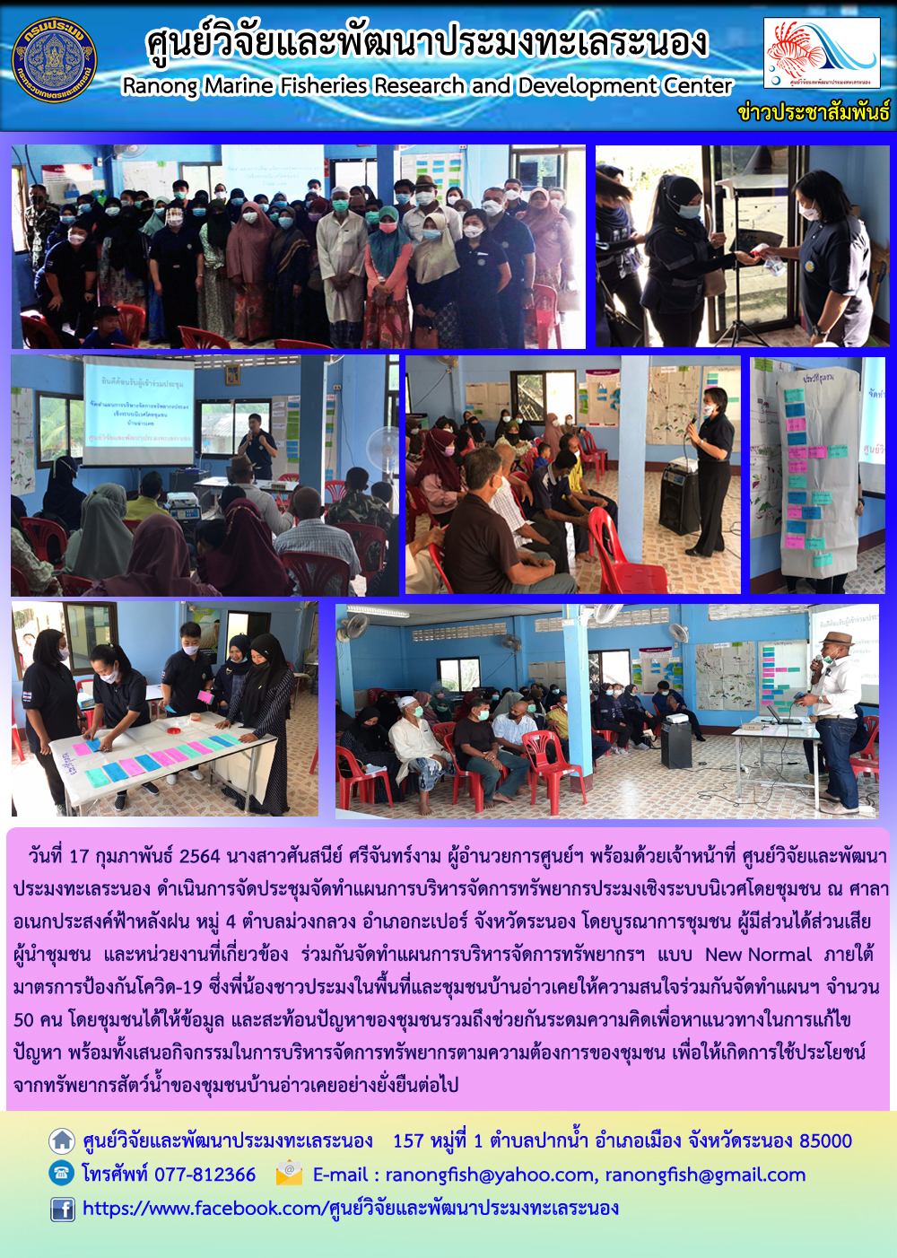 นางสาวศันสนีย์ ศรีจันทร์งาม ผู้อำนวยการศูนย์วิจัยและพัฒนาประมงทะเลระนอง พร้อมด้วยเจ้าหน้าที่ ดำเนินการจัดประชุมจัดทำแผนการบริหารจัดการทรัพยากรประมงเชิงระบบนิเวศน์ โดยชุมชน ณ ศาลาอเนกประสงค์ฟ้าหลังฝน ฯลฯ
