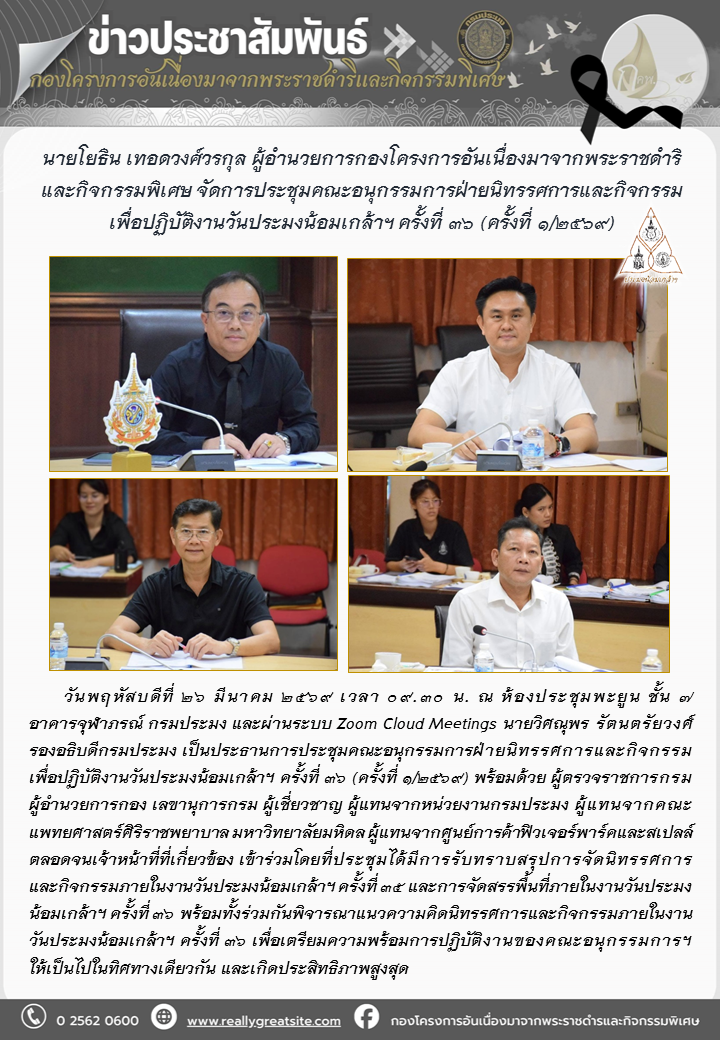 นายโยธิน เทอดวงศ์วรกุล ผู้อำนวยการกองโครงการอันเนื่องมาจากพระราชดำริและกิจกรรมพิเศษ จัดการประชุมคณะอนุกรรมการฝ่ายนิทรรศการและกิจกรรมเพื่อปฏิบัติงานวันประมงน้อมเกล้าฯ ครั้งที่ 36 (ครั้งที่ 1/2569)..คลิก