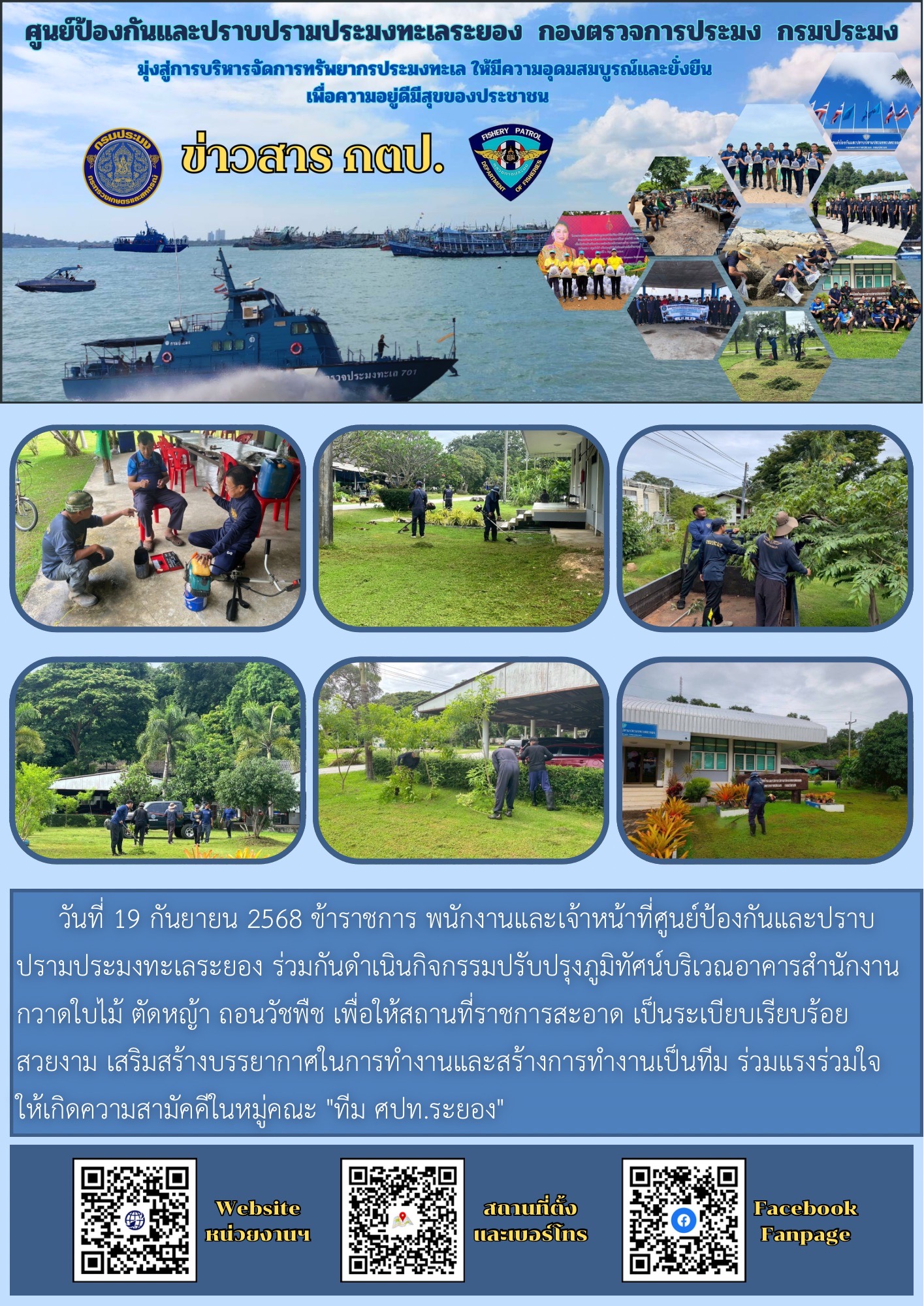 วันที่ 19 กันยายน 2568 ข้าราชการ พนักงานและเจ้าหน้าที่ศูนย์ป้องกันและปราบปรามประมงทะเลระยอง ร่วมกันดำเนินกิจกรรมปรับปรุงภูมิทัศน์บริเวณอาคารสำนักงาน กวาดใบไม้ ตัดหญ้า ถอนวัชพืช เพื่อให้สถานที่ราชการสะอาด เป็นระเบียบเรียบร้อย สวยงาม เสริมสร้างบรรยากาศในการทำงานและสร้างการทำงานเป็นทีม ร่วมแรงร่วมใจ ให้เกิดความสามัคคีในหมู่คณะ "ทีม ศปท.ระยอง"