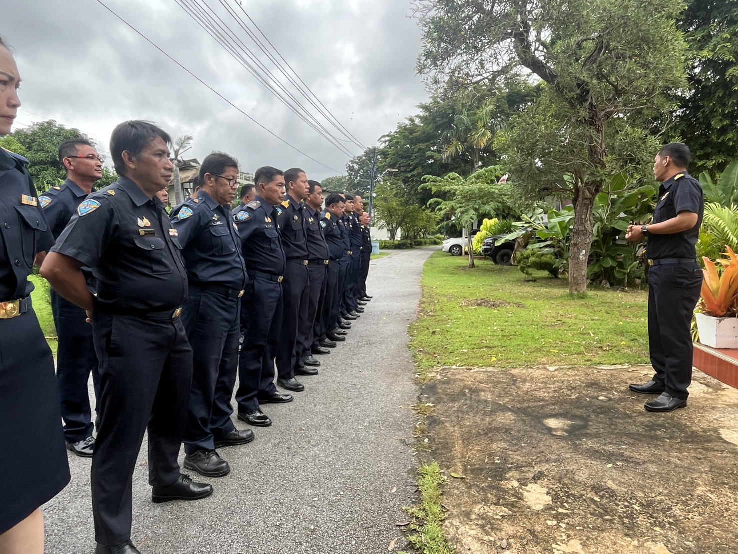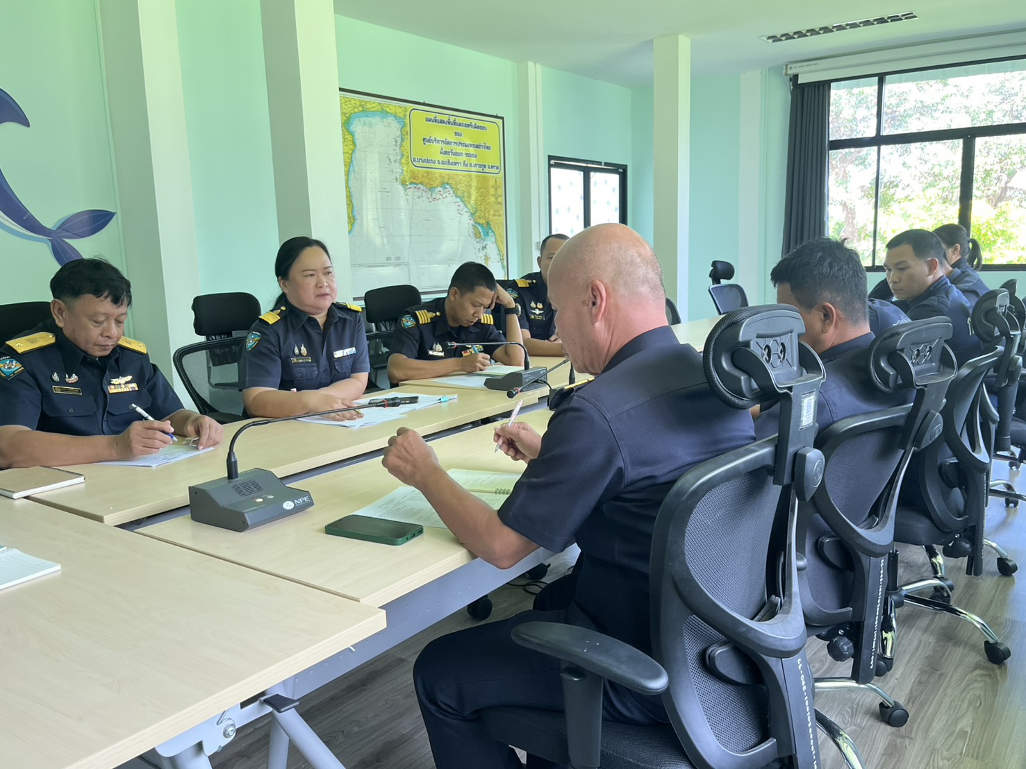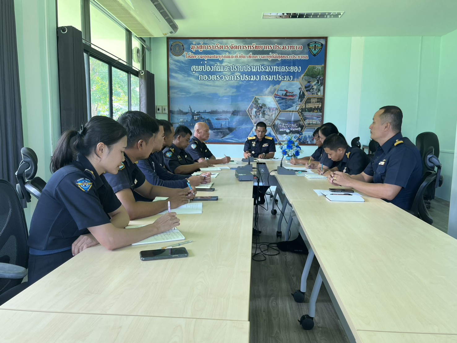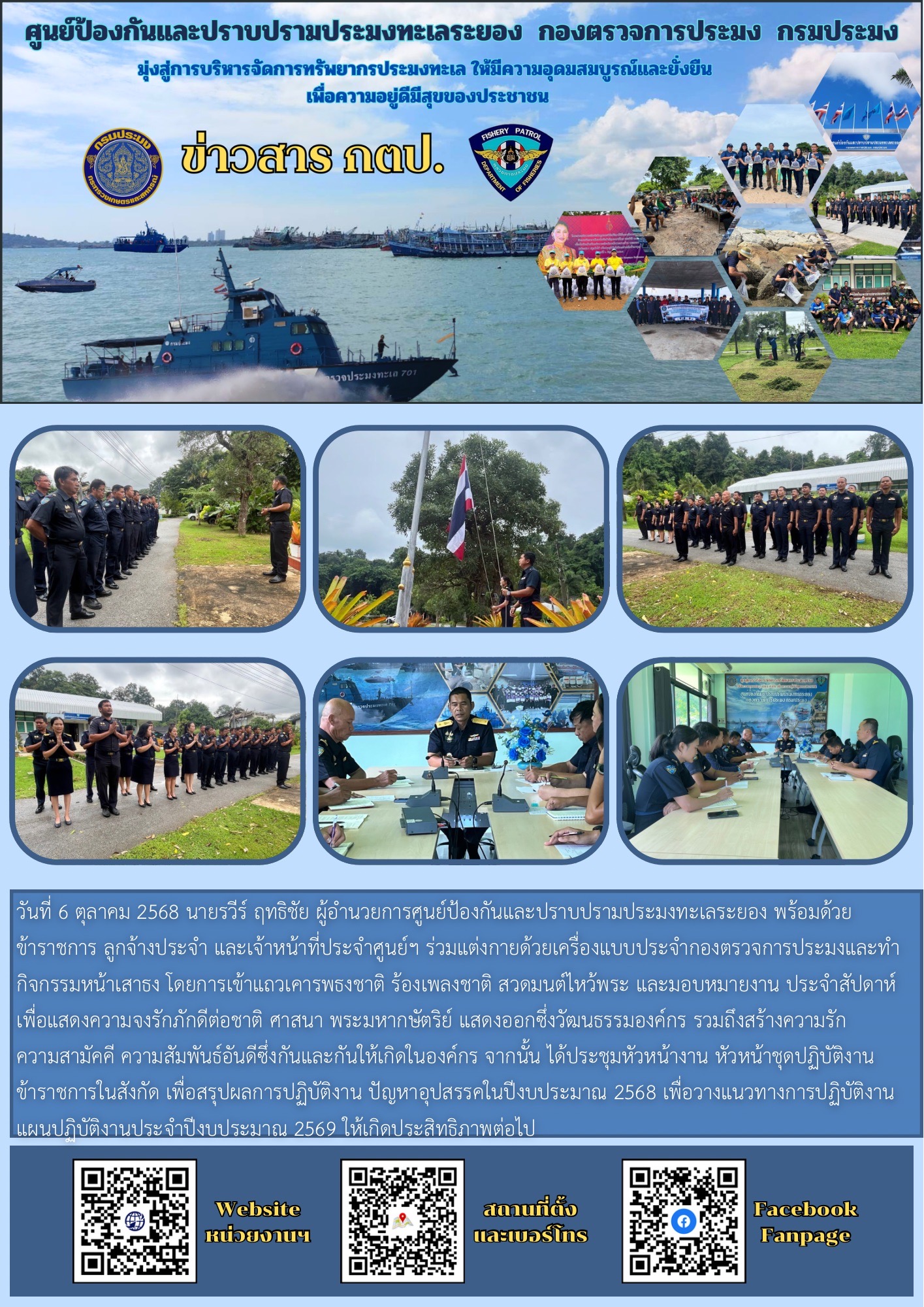 วันที่ 6 ตุลาคม 2568 นายรวีร์ ฤทธิชัย ผู้อำนวยการศูนย์ป้องกันและปราบปรามประมงทะเลระยอง พร้อมด้วยข้าราชการ ลูกจ้างประจำ และเจ้าหน้าที่ประจำศูนย์ฯ ร่วมแต่งกายด้วยเครื่องแบบประจำกองตรวจการประมงและทำกิจกรรมหน้าเสาธง โดยการเข้าแถวเคารพธงชาติ ร้องเพลงชาติ สวดมนต์ไหว้พระ และมอบหมายงาน ประจำสัปดาห์  เพื่อแสดงความจงรักภักดีต่อชาติ ศาสนา พระมหากษัตริย์ แสดงออกซึ่งวัฒนธรรมองค์กร รวมถึงสร้างความรัก ความสามัคคี ความสัมพันธ์อันดีซึ่งกันและกันให้เกิดในองค์กร จากนั้น ได้ประชุมหัวหน้างาน หัวหน้าชุดปฏิบัติงาน ข้าราชการในสังกัด เพื่อสรุปผลการปฏิบัติงาน ปัญหาอุปสรรคในปีงบประมาณ 2568 เพื่อวางแนวทางการปฏิบัติงาน แผนปฏิบัติงานประจำปีงบประมาณ 2569 ให้เกิดประสิทธิภาพต่อไป