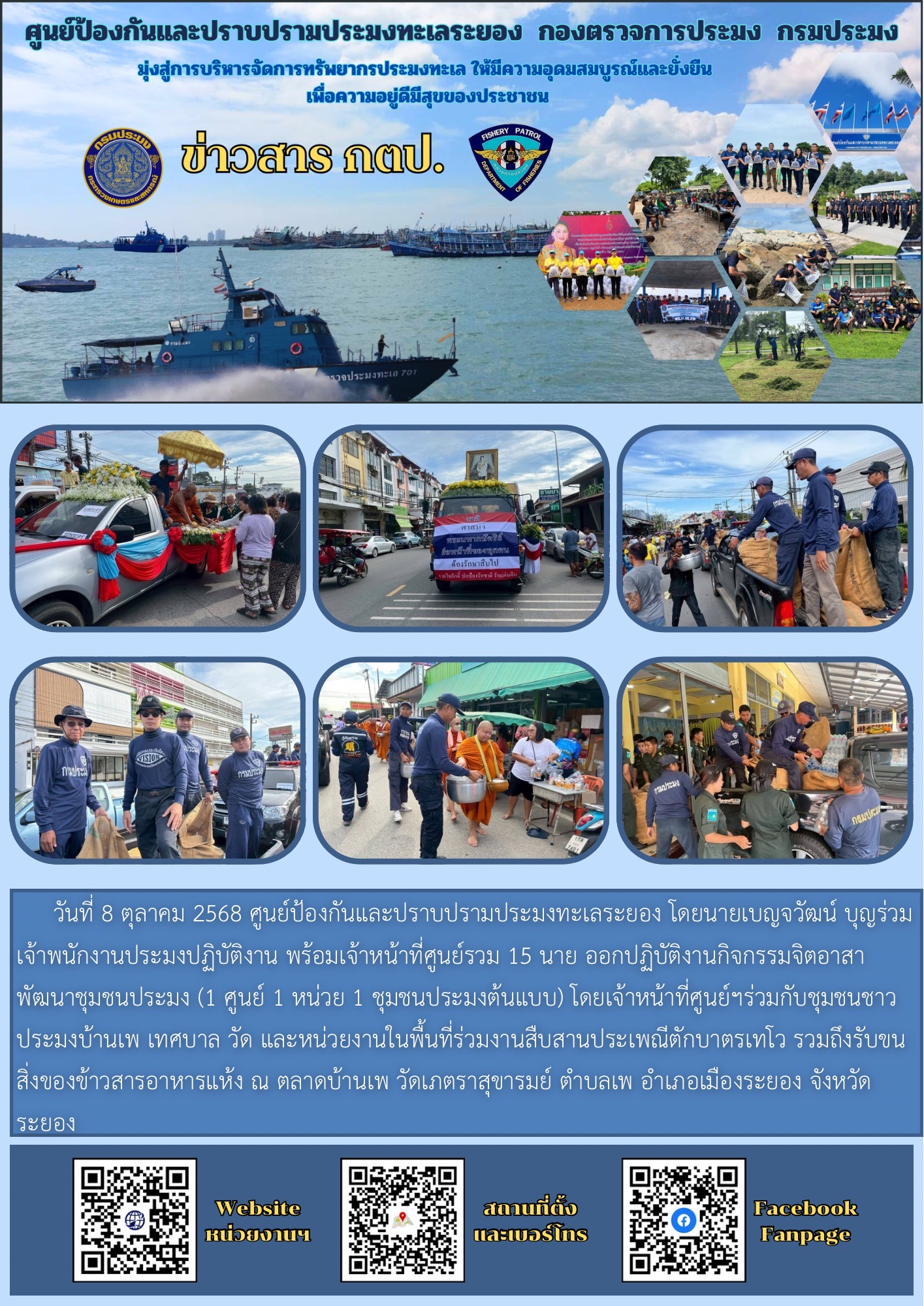 วันที่ 8 ตุลาคม 2568 ศูนย์ป้องกันและปราบปรามประมงทะเลระยอง โดยนายเบญจวัฒน์ บุญร่วม เจ้าพนักงานประมงปฏิบัติงาน พร้อมเจ้าหน้าที่ศูนย์รวม 15 นาย ออกปฏิบัติงานกิจกรรมจิตอาสาพัฒนาชุมชนประมง (1 ศูนย์ 1 หน่วย 1 ชุมชนประมงต้นแบบ) โดยเจ้าหน้าที่ศูนย์ฯร่วมกับชุมชนชาวประมงบ้านเพ เทศบาล วัด และหน่วยงานในพื้นที่ร่วมงานสืบสานประเพณีตักบาตรเทโว รวมถึงรับขนสิ่งของข้าวสารอาหารแห้ง ณ ตลาดบ้านเพ วัดเภตราสุขารมย์ ตำบลเพ อำเภอเมืองระยอง จังหวัดระยอง
