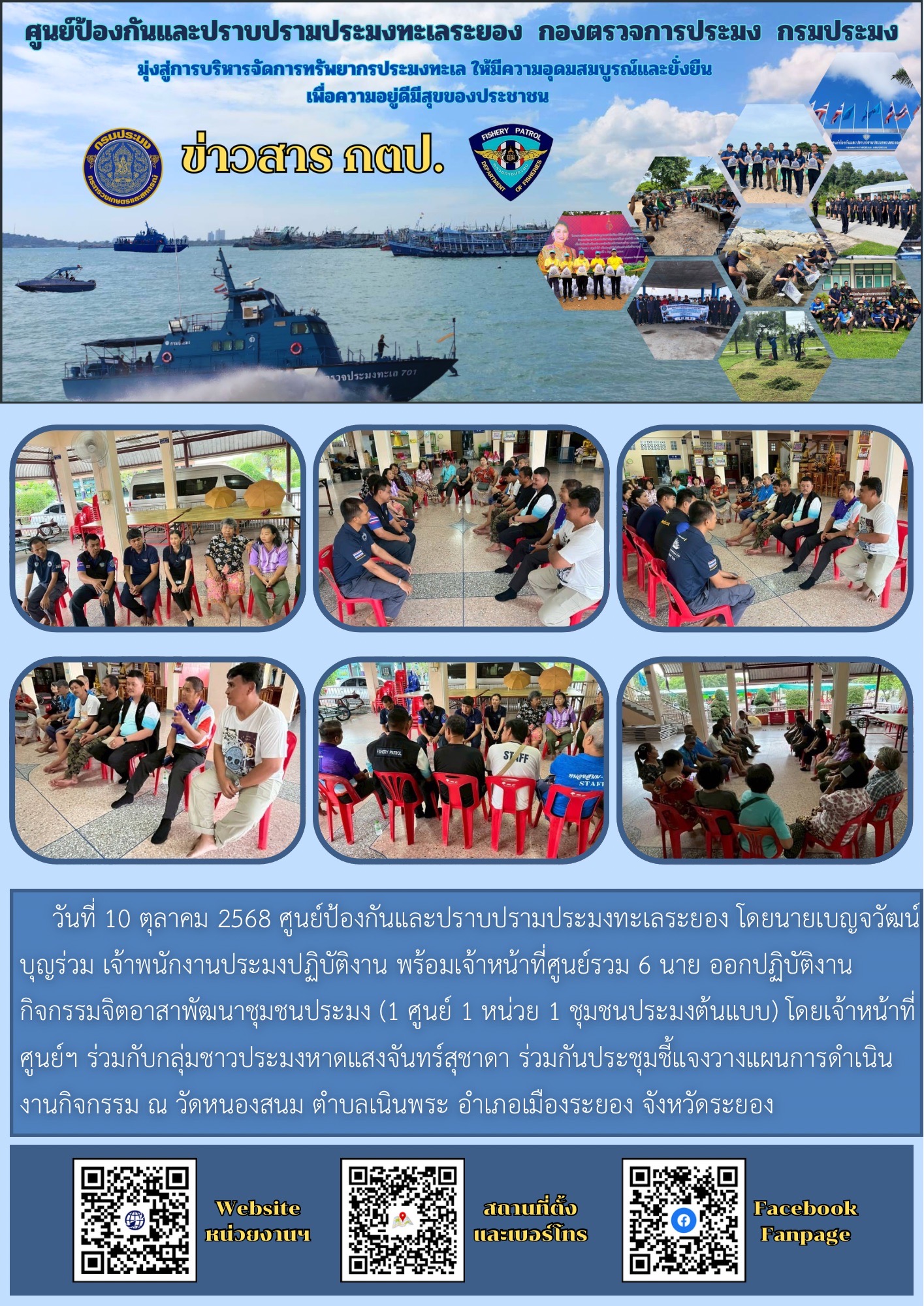 วันที่ 10 ตุลาคม 2568 ศูนย์ป้องกันและปราบปรามประมงทะเลระยอง โดยนายเบญจวัฒน์ บุญร่วม เจ้าพนักงานประมงปฏิบัติงาน พร้อมเจ้าหน้าที่ศูนย์รวม 6 นาย ออกปฏิบัติงานกิจกรรมจิตอาสาพัฒนาชุมชนประมง (1 ศูนย์ 1 หน่วย 1 ชุมชนประมงต้นแบบ) โดยเจ้าหน้าที่ศูนย์ฯ ร่วมกับกลุ่มชาวประมงหาดแสงจันทร์สุชาดา ร่วมกันประชุมชี้แจงวางแผนการดำเนินงานกิจกรรม ณ วัดหนองสนม ตำบลเนินพระ อำเภอเมืองระยอง จังหวัดระยอง