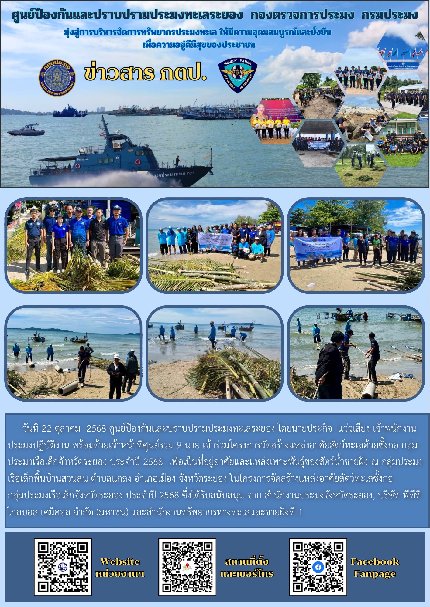 วันที่ 22 ตุลาคม  2568 ศูนย์ป้องกันและปราบปรามประมงทะเลระยอง โดยนายประกิจ  แว่วเสียง เจ้าพนักงานประมงปฏิบัติงาน พร้อมด้วยเจ้าหน้าที่ศูนย์รวม 9 นาย เข้าร่วมโครงการจัดสร้างแหล่งอาศัยสัตว์ทะเลด้วยซั้งกอ กลุ่มประมงเรือเล็กจังหวัดระยอง ประจำปี 2568  เพื่อเป็นที่อยู่อาศัยและแหล่งเพาะพันธุ์ของสัตว์น้ำชายฝั่ง ณ กลุ่มประมงเรือเล็กพื้นบ้านสวนสน ตำบลแกลง อำเภอเมือง จังหวัดระยอง ในโครงการจัดสร้างแหล่งอาศัยสัตว์ทะเลซั้งกอ กลุ่มประมงเรือเล็กจังหวัดระยอง ประจำปี 2568 ซึ่งได้รับสนับสนุน จาก สำนักงานประมงจังหวัดระยอง, บริษัท พีทีที โกลบอล เคมิคอล จำกัด (มหาชน) และสำนักงานทรัพยากรทางทะเลและชายฝั่งที่ 1