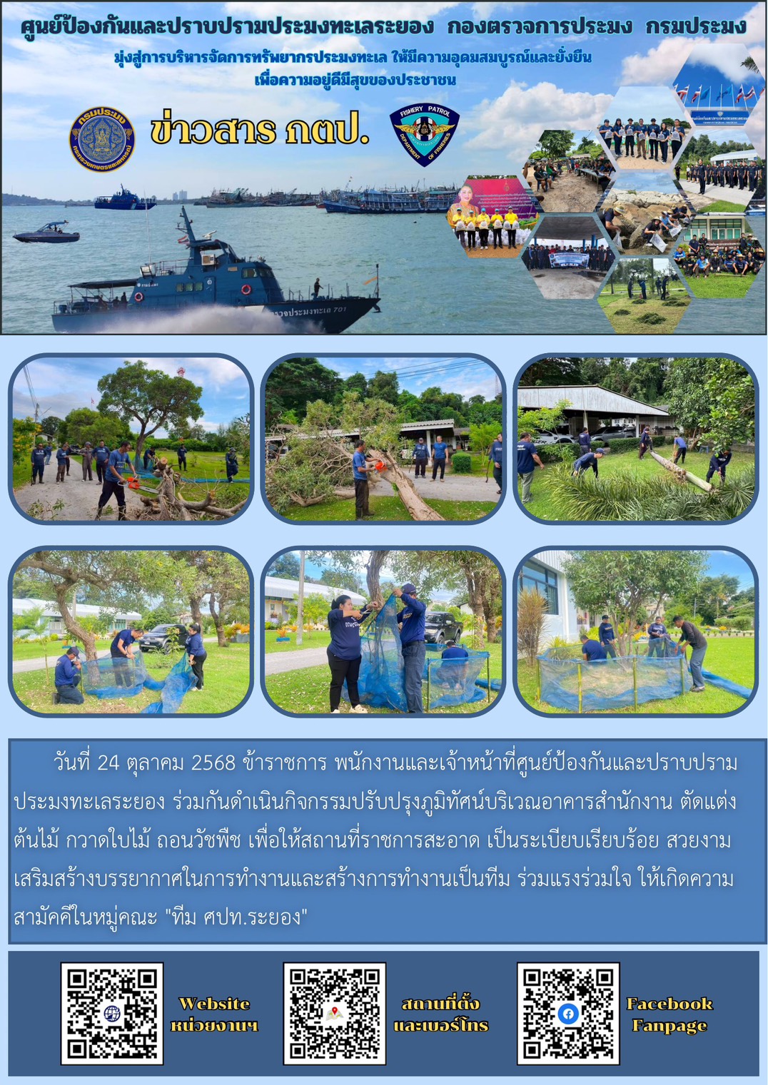 วันที่ 24 ตุลาคม 2568 ข้าราชการ พนักงานและเจ้าหน้าที่ศูนย์ป้องกันและปราบปรามประมงทะเลระยอง ร่วมกันดำเนินกิจกรรมปรับปรุงภูมิทัศน์บริเวณอาคารสำนักงาน ตัดแต่งต้นไม้ กวาดใบไม้ ถอนวัชพืช เพื่อให้สถานที่ราชการสะอาด เป็นระเบียบเรียบร้อย สวยงาม เสริมสร้างบรรยากาศในการทำงานและสร้างการทำงานเป็นทีม ร่วมแรงร่วมใจ ให้เกิดความสามัคคีในหมู่คณะ "ทีม ศปท.ระยอง"