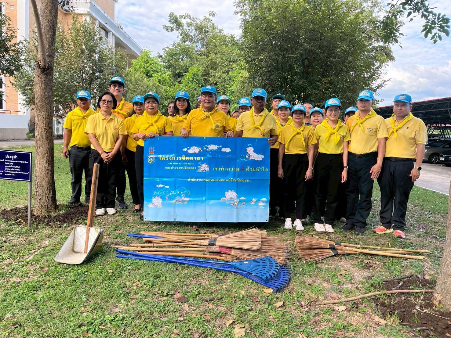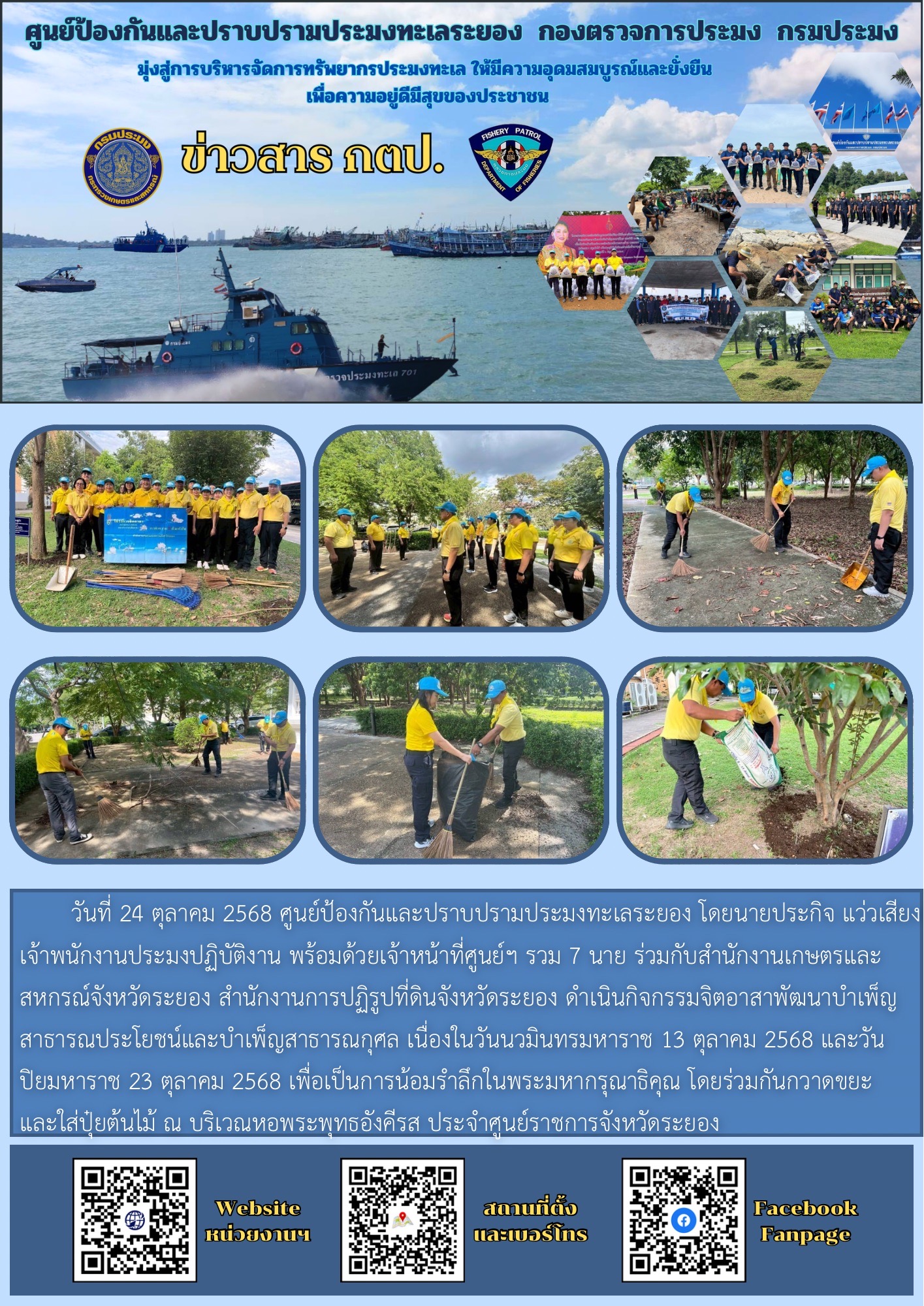 วันที่ 24 ตุลาคม 2568 ศูนย์ป้องกันและปราบปรามประมงทะเลระยอง โดยนายประกิจ แว่วเสียง เจ้าพนักงานประมงปฏิบัติงาน พร้อมด้วยเจ้าหน้าที่ศูนย์ฯ รวม 7 นาย ร่วมกับสำนักงานเกษตรและสหกรณ์จังหวัดระยอง สำนักงานการปฏิรูปที่ดินจังหวัดระยอง ดำเนินกิจกรรมจิตอาสาพัฒนาบำเพ็ญสาธารณประโยชน์และบำเพ็ญสาธารณกุศล เนื่องในวันนวมินทรมหาราช 13 ตุลาคม 2568 และวันปิยมหาราช 23 ตุลาคม 2568 เพื่อเป็นการน้อมรำลึกในพระมหากรุณาธิคุณ โดยร่วมกันกวาดขยะ และใส่ปุ๋ยต้นไม้ ณ บริเวณหอพระพุทธอังคีรส ประจำศูนย์ราชการจังหวัดระยอง