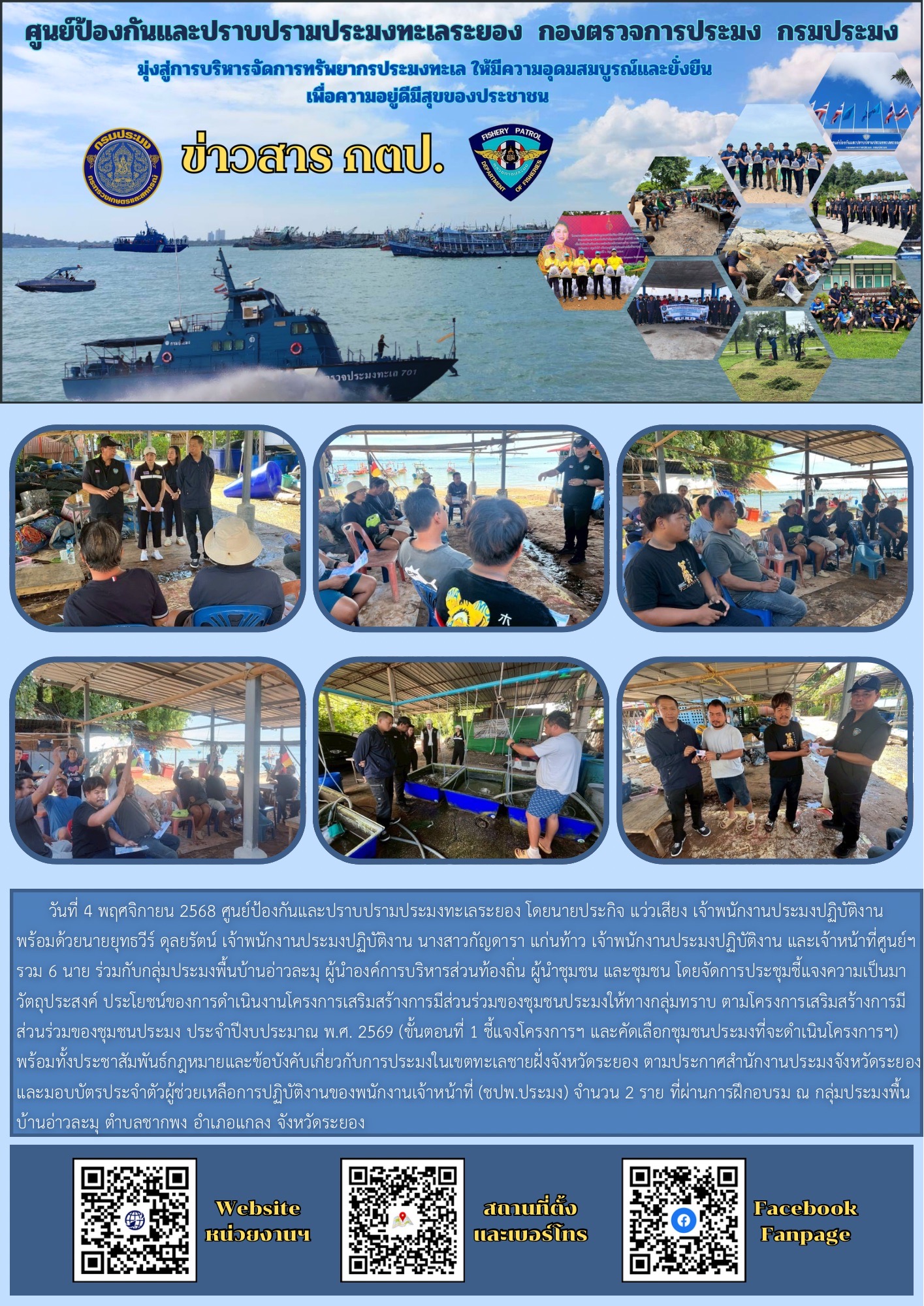 วันที่ 4 พฤศจิกายน 2568 ศูนย์ป้องกันและปราบปรามประมงทะเลระยอง โดยนายประกิจ แว่วเสียง เจ้าพนักงานประมงปฏิบัติงาน พร้อมด้วยนายยุทธวีร์ ดุลยรัตน์ เจ้าพนักงานประมงปฏิบัติงาน นางสาวกัญดารา แก่นท้าว เจ้าพนักงานประมงปฏิบัติงาน และเจ้าหน้าที่ศูนย์ฯ รวม 6 นาย ร่วมกับกลุ่มประมงพื้นบ้านอ่าวละมุ ผู้นำองค์การบริหารส่วนท้องถิ่น ผู้นำชุมชน และชุมชน โดยจัดการประชุมชี้แจงความเป็นมาวัตถุประสงค์ ประโยชน์ของการดำเนินงานโครงการเสริมสร้างการมีส่วนร่วมของชุมชนประมงให้ทางกลุ่มทราบ ตามโครงการเสริมสร้างการมีส่วนร่วมของชุมชนประมง ประจำปีงบประมาณ พ.ศ. 2569 (ขั้นตอนที่ 1 ชี้แจงโครงการฯ และคัดเลือกชุมชนประมงที่จะดำเนินโครงการฯ) พร้อมทั้งประชาสัมพันธ์กฎหมายและข้อบังคับเกี่ยวกับการประมงในเขตทะเลชายฝั่งจังหวัดระยอง ตามประกาศสำนักงานประมงจังหวัดระยอง และมอบบัตรประจำตัวผู้ช่วยเหลือการปฏิบัติงานของพนักงานเจ้าหน้าที่ (ชปพ.ประมง) จำนวน 2 ราย ที่ผ่านการฝึกอบรม ณ กลุ่มประมงพื้นบ้านอ่าวละมุ ตำบลชากพง อำเภอแกลง จังหวัดระยอง