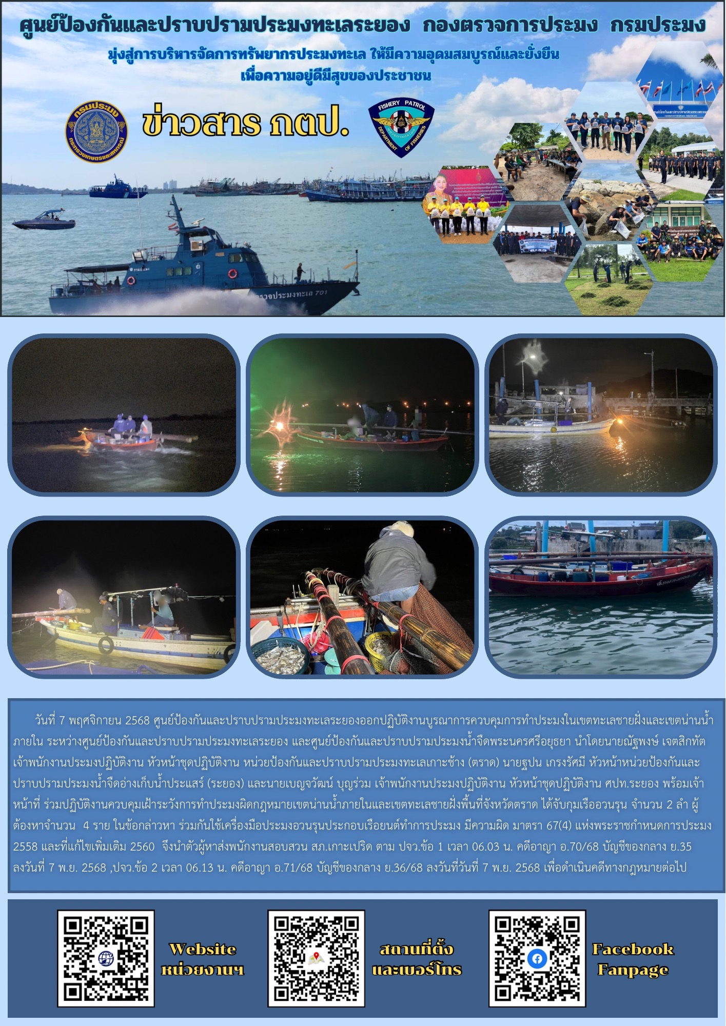 วันที่ 7 พฤศจิกายน 2568 ศูนย์ป้องกันและปราบปรามประมงทะเลระยองออกปฏิบัติงานบูรณาการควบคุมการทําประมงในเขตทะเลชายฝั่งและเขตน่านน้ำภายใน ระหว่างศูนย์ป้องกันและปราบปรามประมงทะเลระยอง และศูนย์ป้องกันและปราบปรามประมงน้ำจืดพระนครศรีอยุธยา นำโดยนายณัฐพงษ์ เจตสิกทัต เจ้าพนักงานประมงปฏิบัติงาน หัวหน้าชุดปฏิบัติงาน หน่วยป้องกันและปราบปรามประมงทะเลเกาะช้าง (ตราด) นายฐปน เกรงรัศมี หัวหน้าหน่วยป้องกันและปราบปรามประมงน้ำจืดอ่างเก็บน้ำประแสร์ (ระยอง) และนายเบญจวัฒน์ บุญร่วม เจ้าพนักงานประมงปฏิบัติงาน หัวหน้าชุดปฏิบัติงาน ศปท.ระยอง พร้อมเจ้าหน้าที่ ร่วมปฏิบัติงานควบคุมเฝ้าระวังการทําประมงผิดกฎหมายเขตน่านน้ำภายในและเขตทะเลชายฝั่งพื้นที่จังหวัดตราด ได้จับกุมเรืออวนรุน จำนวน 2 ลำ ผู้ต้องหาจำนวน  4 ราย ในข้อกล่าวหา ร่วมกันใช้เครื่องมือประมงอวนรุนประกอบเรือยนต์ทำการประมง มีความผิด มาตรา 67(4) แห่งพระราชกำหนดการประมง 2558 และที่แก้ไขเพิ่มเติม 2560  จึงนำตัวผู้หาส่งพนักงานสอบสวน สภ.เกาะเปริด ตาม ปจว.ข้อ 1 เวลา 06.03 น. คดีอาญา อ.70/68 บัญชีของกลาง ย.35 ลงวันที่ 7 พ.ย. 2568 ,ปจว.ข้อ 2 เวลา 06.13 น. คดีอาญา อ.71/68 บัญชีของกลาง ย.36/68 ลงวันที่วันที่ 7 พ.ย. 2568 เพื่อดำเนินคดีทางกฎหมายต่อไป